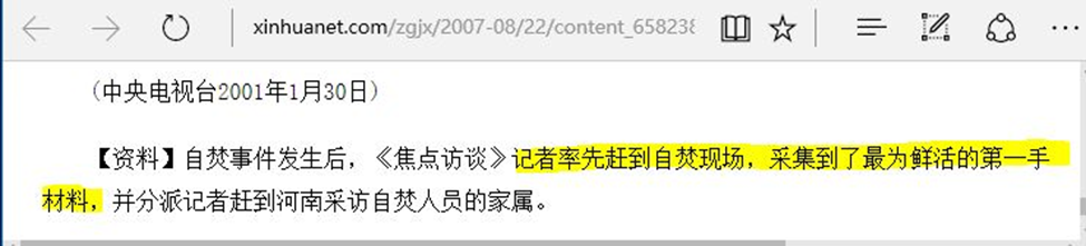 [154]央视“焦点访谈”女记者李玉强承认“自焚”镜头有假. 明慧网, 2003-05-14, https://www. minghui. org/mh/articles/2003/5/14/50261. html