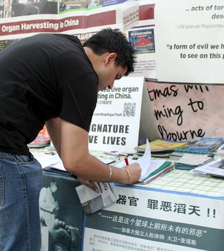 来自中东的留学生苏赫尔(Suhail)也是第一次听说法轮功受迫害以及活摘器官的暴行,他说:“太不幸了,这就是群体灭绝,历史在重复着。我希望通过签名为制止迫害、制止活摘器官贡献自己的微薄之力。我真的很高兴今天能遇到法轮功学员。”“我还会继续上网关注事情的发展,也会和我的朋友们分享了解到的这一切。”