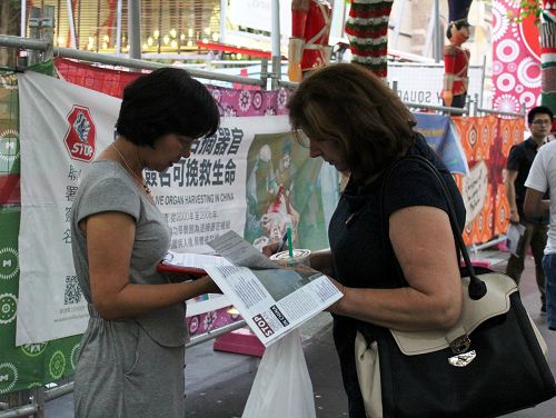 随着人潮的涌入,法轮功学员祥和的五套功法展示和真相资料,让很多市民和游客驻足,不少是第一次听闻世界上发生着如此残酷的迫害,纷纷表示支持法轮功学员的努力,希望迫害元凶能早日被绳之以法。