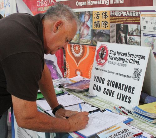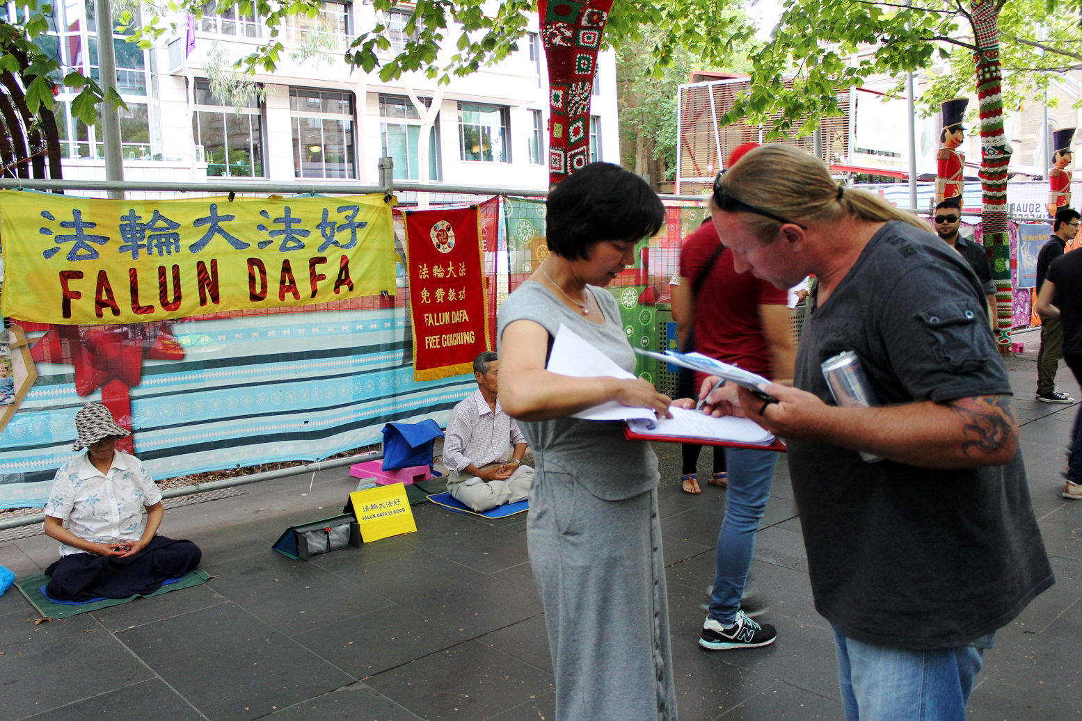 ![]() 图6:苏利文(Sullivan)女士和家人来自距离墨尔本三小时车程的奥尔伯里市,她听说过法轮功,但第一次有机会签名,她说:“我希望活摘器官的暴行能尽快被制止。” |