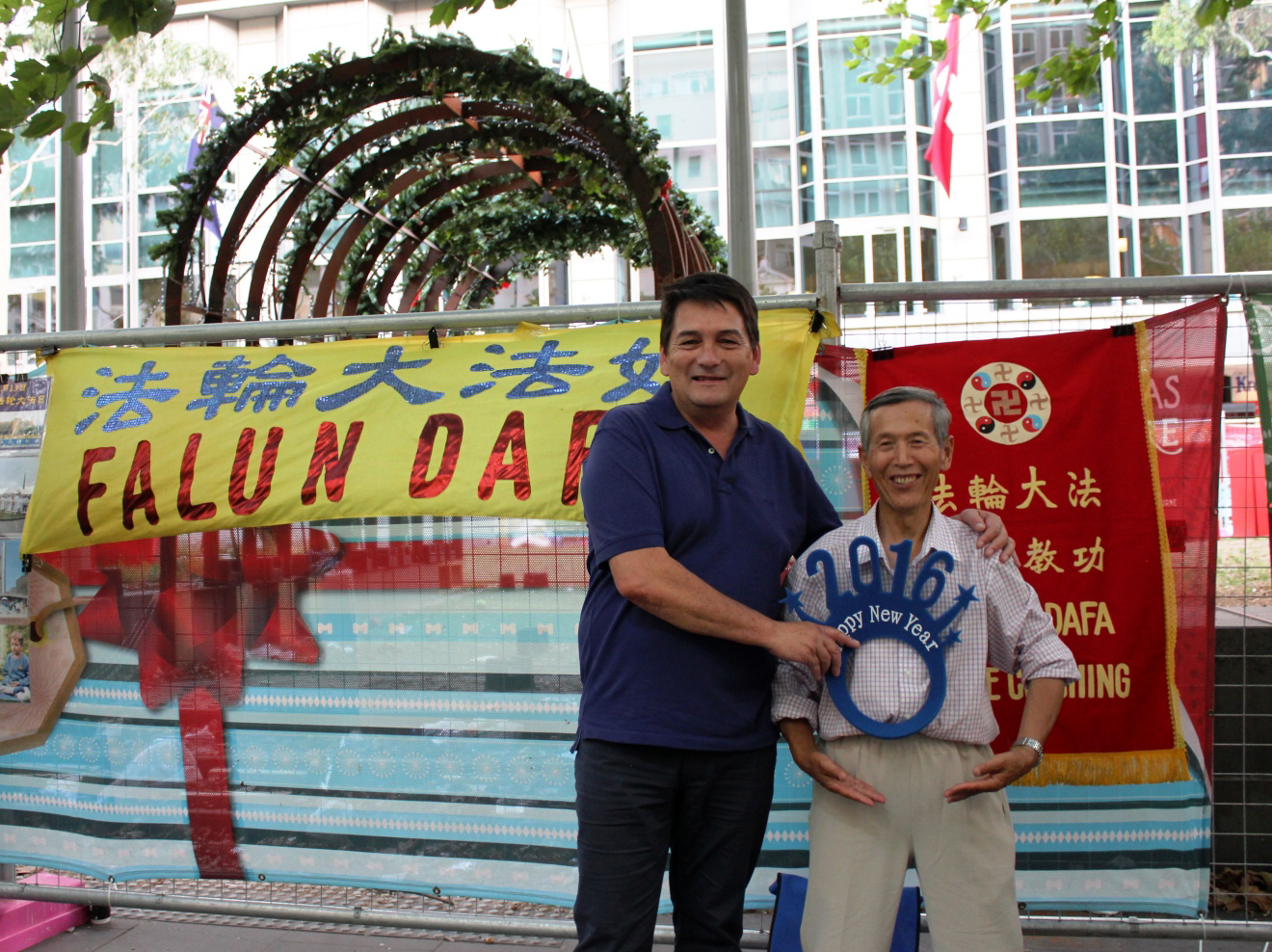 ![]() 图7:来自悉尼的游客贝伊斯(Mick Bayiis)先生和法轮功学员合影。 |