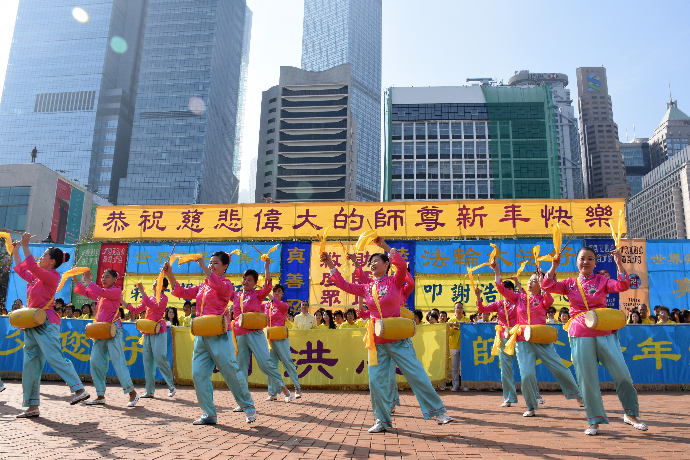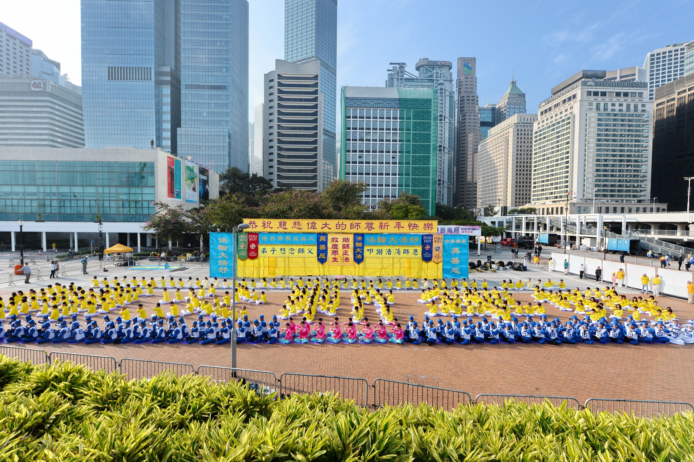 ![]() 图2:二零一六年元旦,法轮功学员在香港中环爱丁堡广场排字炼功,恭祝法轮功创始人李洪志先生新年快乐。 |