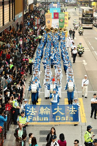 ![]() 图6-8:法轮功学员游行香港市区,传送法轮大法美好的讯息。 |