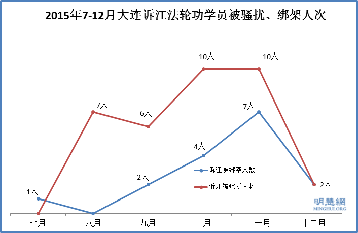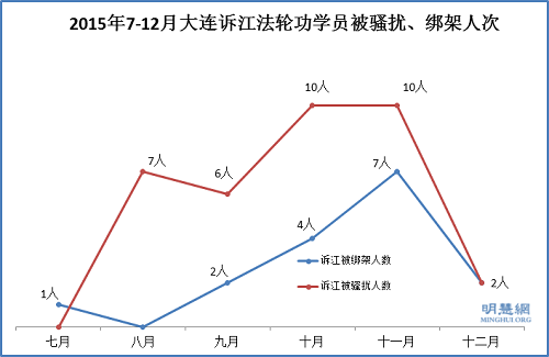 | 11月 (11人) | 11月4日 11月上旬 11月12日 11月15日 11月16日 11月17日 11月18日 11月19日 | 谭素云(诉江) 林均燕(诉江) 刘丽君 曲桂贤(诉江) 刘阳(诉江) 李燕(诉江) 阎中华(诉江) 都润红(诉江) 王淑敏(诉江) 魏金香(诉江) 尹金芝(诉江) | 金州区光明派出所警察3人和社区人员 春柳派出所的警察 天津街派出所和中山区国保(抄家) 春柳派出所 秀月派出所 辛寨子派出所警察 瓦房店市五、六个警察 大连湾边防派出所 大连湾边防派出所 大连湾边防派出所 大连湾边防派出所 |