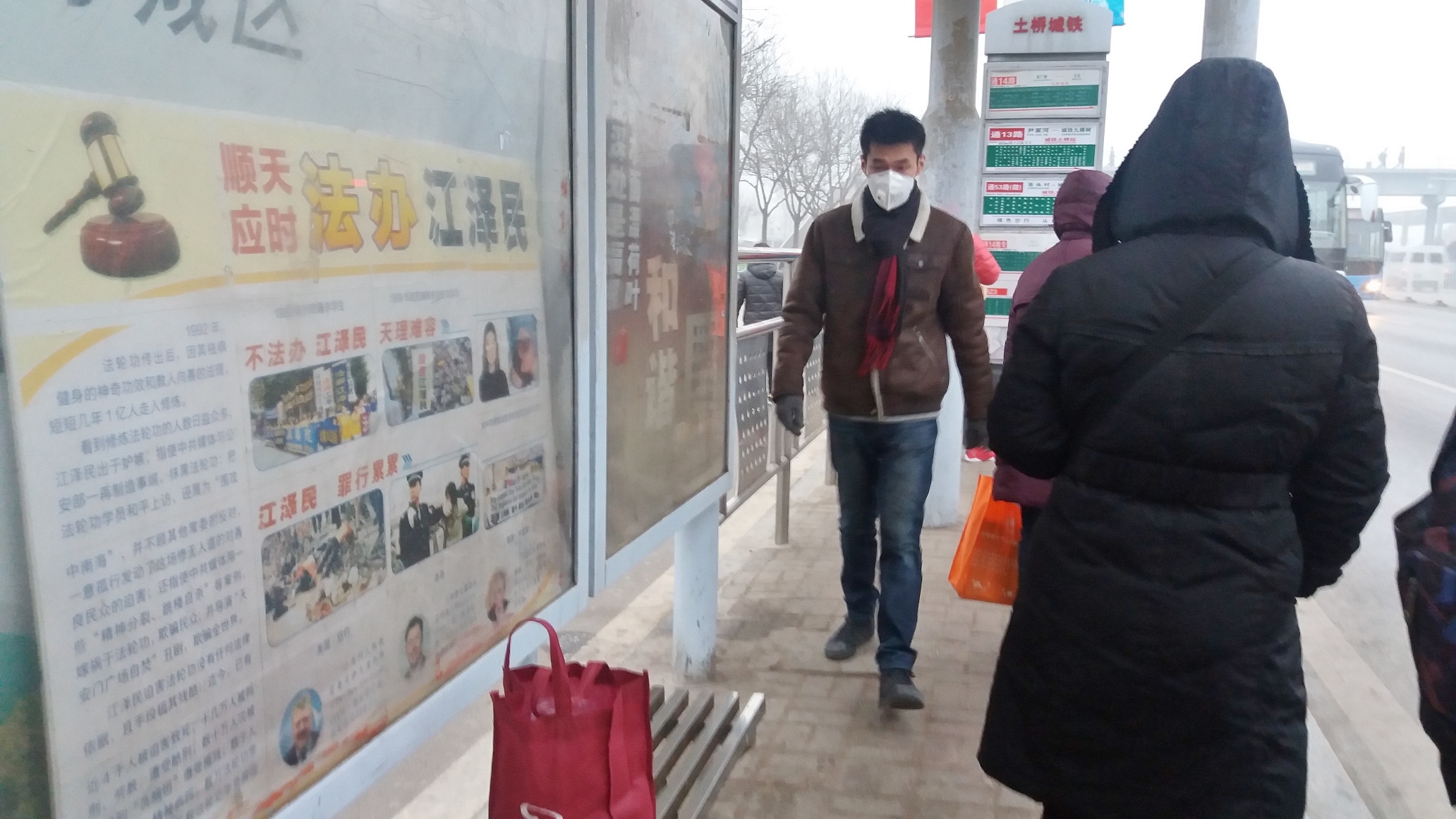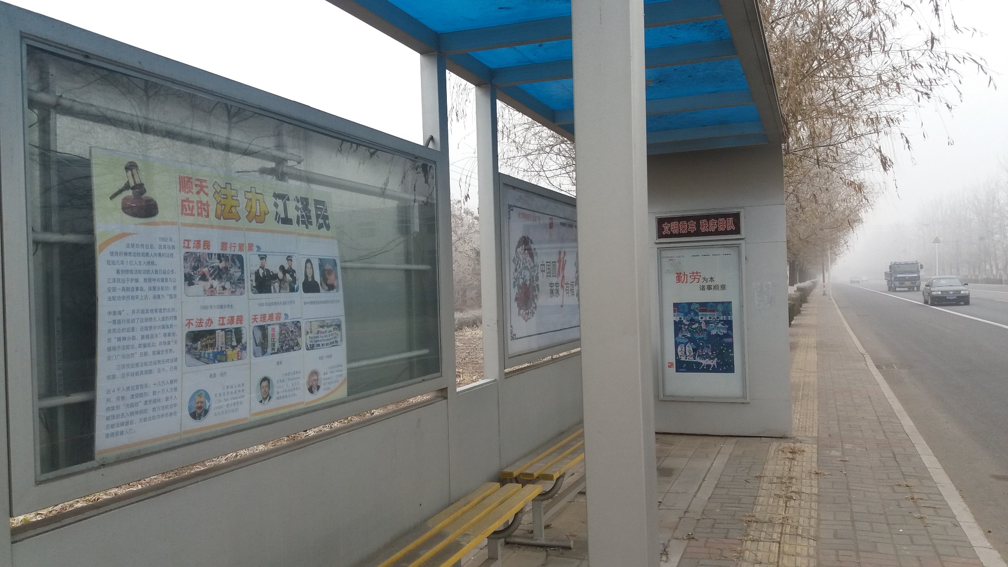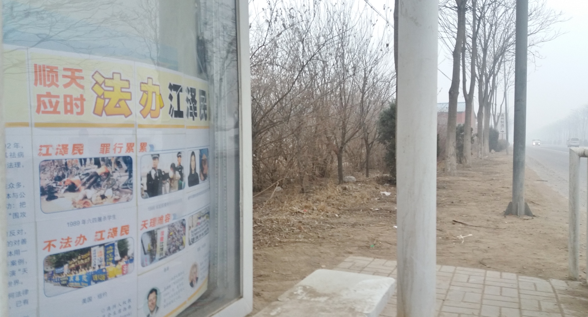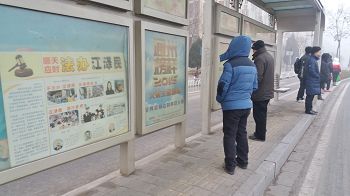 【明慧网二零一六年一月四日】在北京的街头巷尾、公交车站等处,人们都可看到有关起诉江泽民的信息。展板以图文并茂的形式,向人们揭示江泽民对法轮功的迫害,以及来自世界各地对起诉江泽民的正义支持。