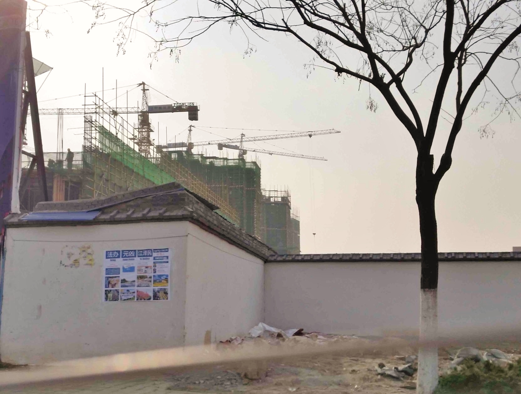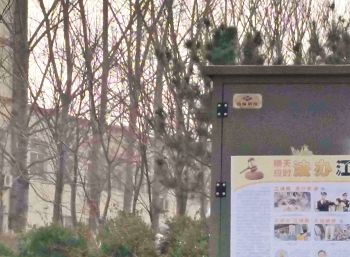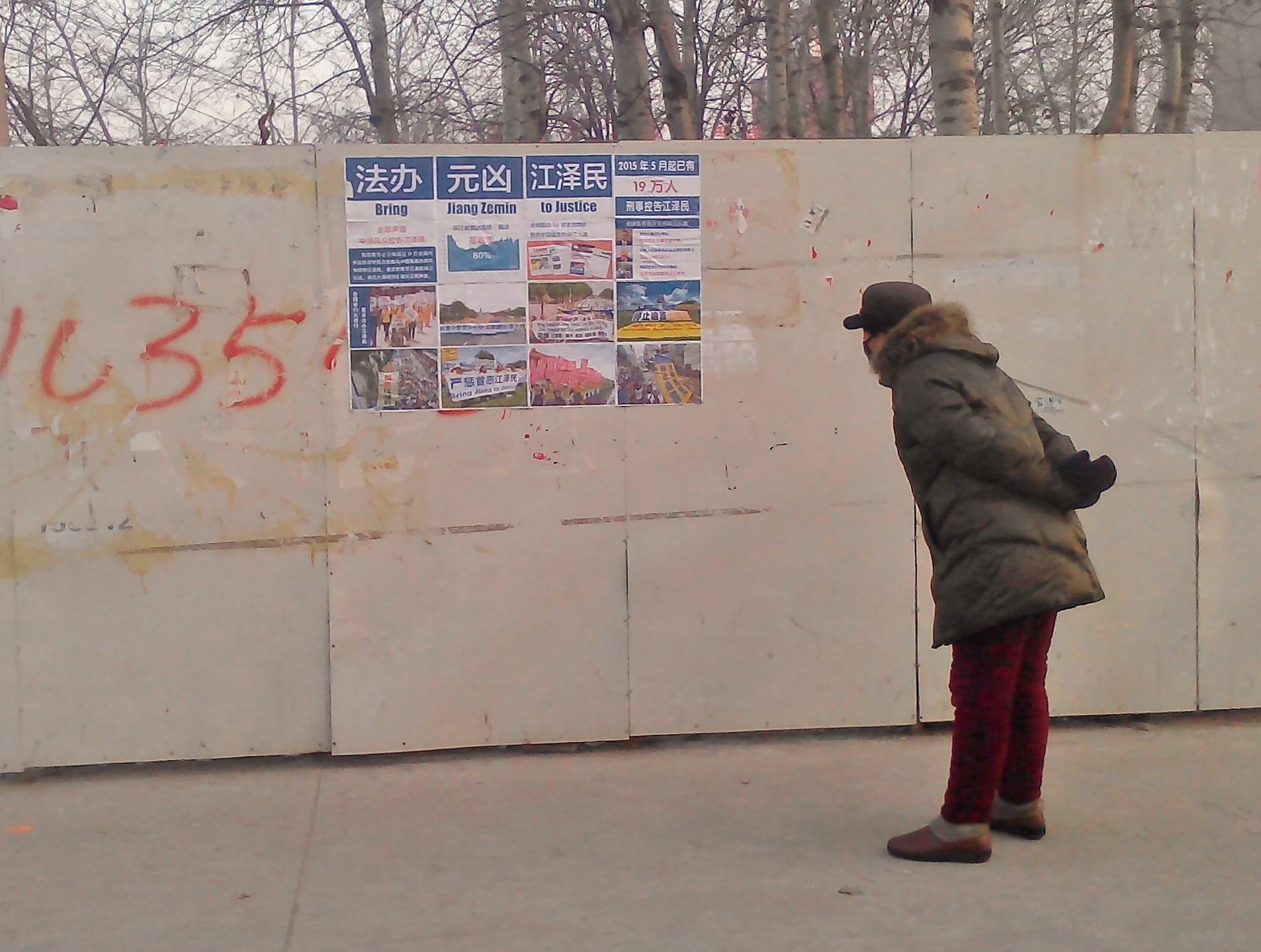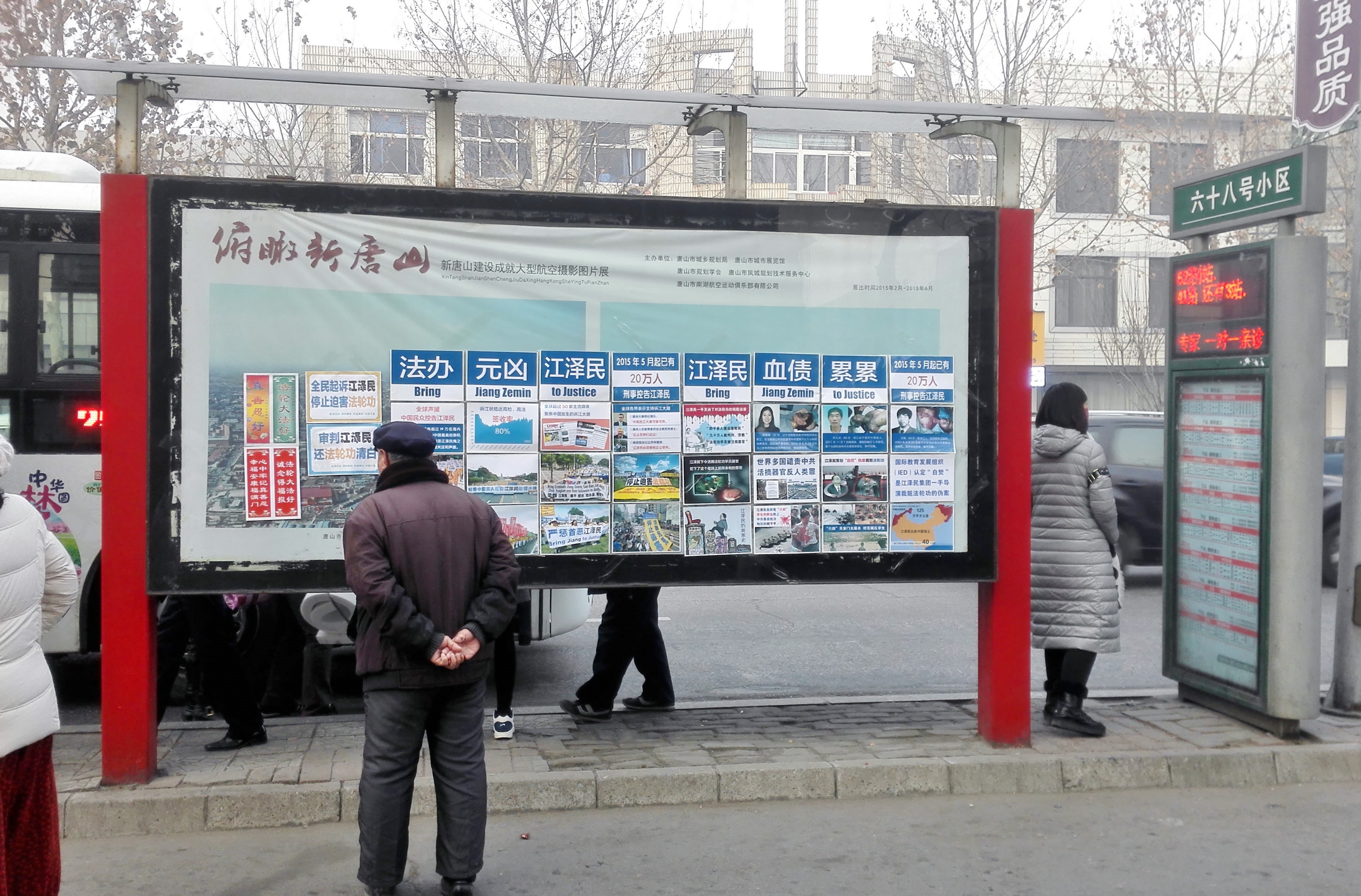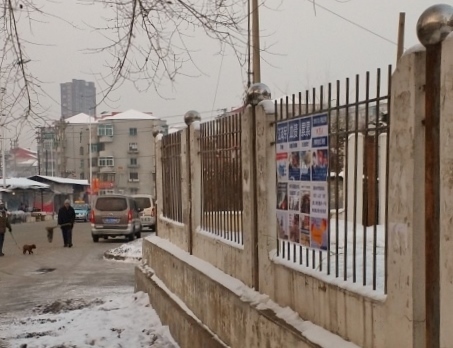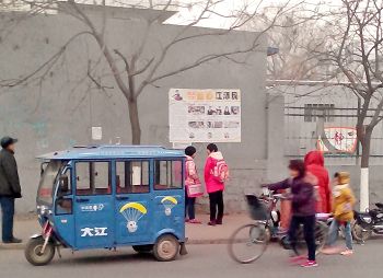 这是在唐山一县城小学城墙上的诉江展板,在上下学高峰期有很多家长和学生围观。