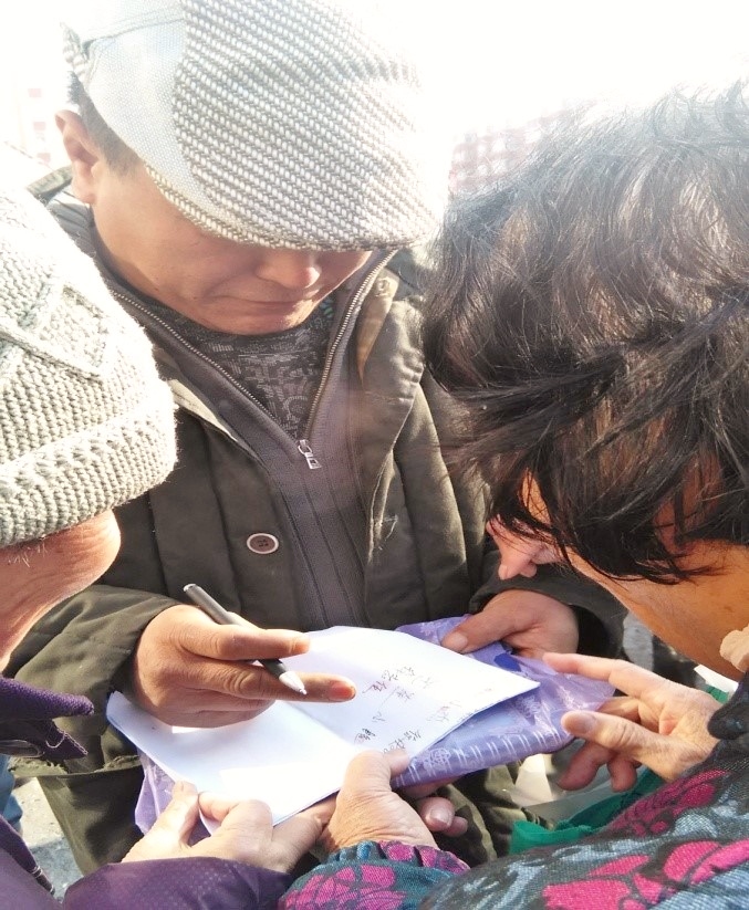 民众A:我签自己的名字,江泽民早该抓起来了,我去台湾都能看到炼法轮功的,随便炼,就江泽民迫害你们这些好人。