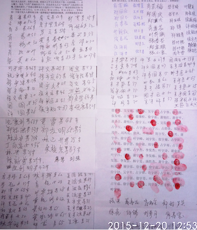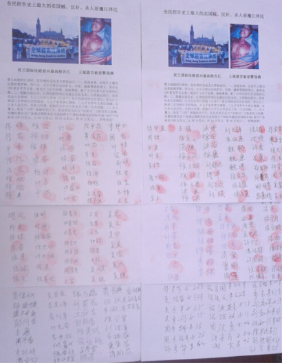听闻江泽民的累累罪恶,不少人主动签真名、盖手印举报,同时还出资告江。有的说:“一定要告倒他!”一位六十三岁的农妇讲起江泽民时说:“这个人做的这么坏,我要告!”于是还让家里的两个儿子及媳妇、女儿、女婿等全家人都一起联署举报了江贼。