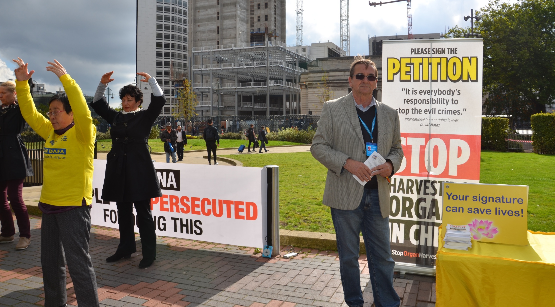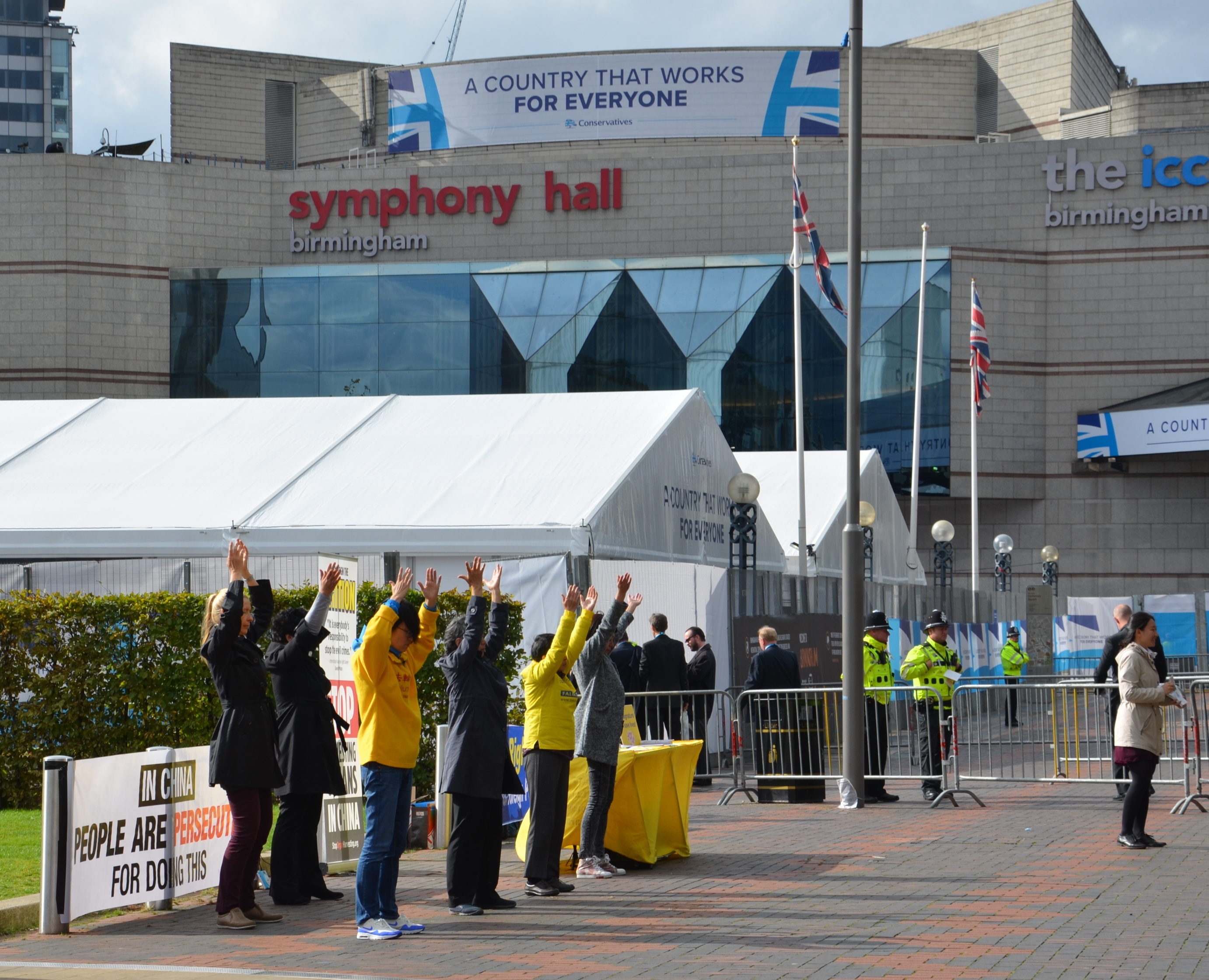 图1:英国执政党召开党代会年会期间,英国部分法轮功学员在会场外集体炼功,揭中共活摘罪行。