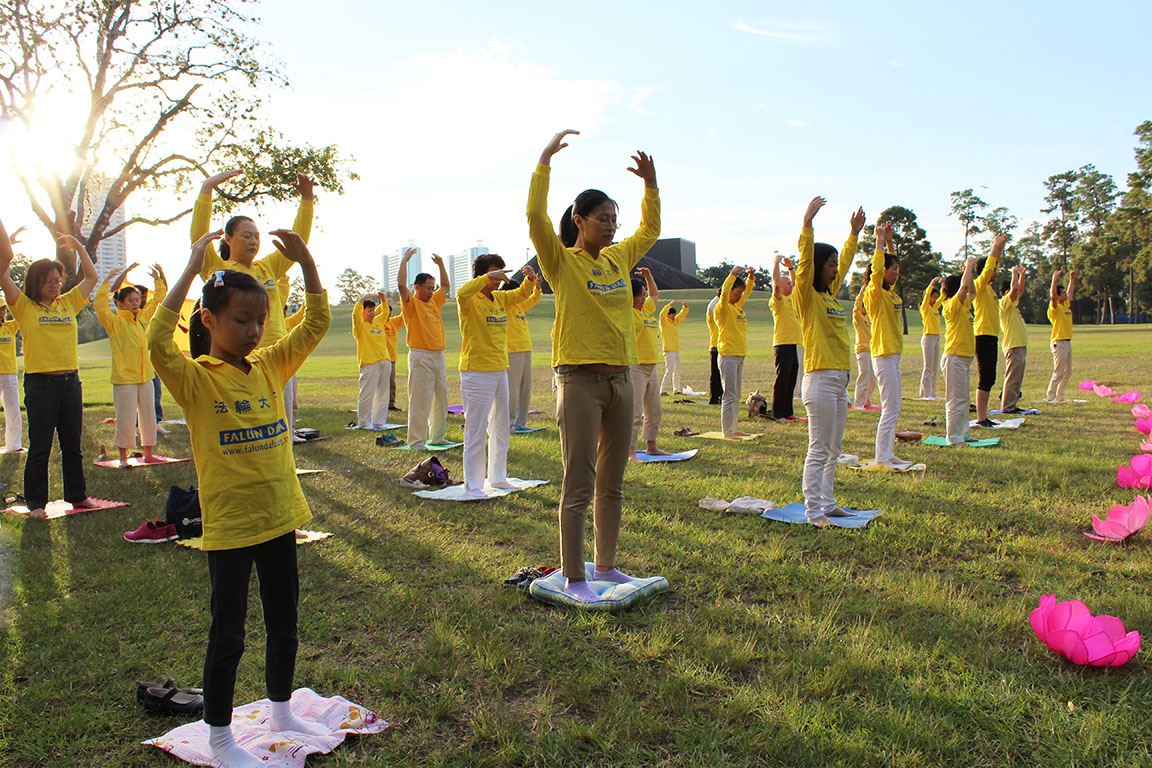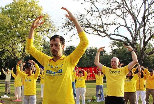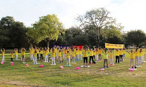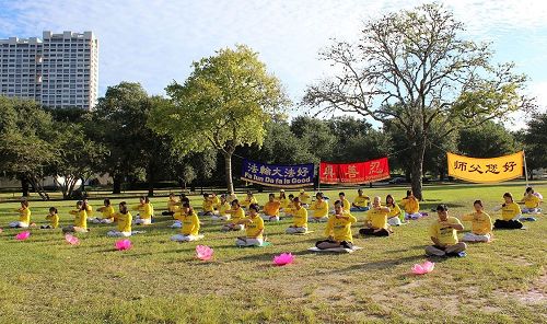 九日早晨,休斯顿法轮功学员在荷门公园(Hermann Park)悬挂横幅,展示“法轮大法好”、“真善忍”、“师父您好”的信息。学员们身着黄色炼功服,展示优美、缓慢的炼功动作,在这个以往只是市民休闲、运动的公园形成一道美丽的风景线。