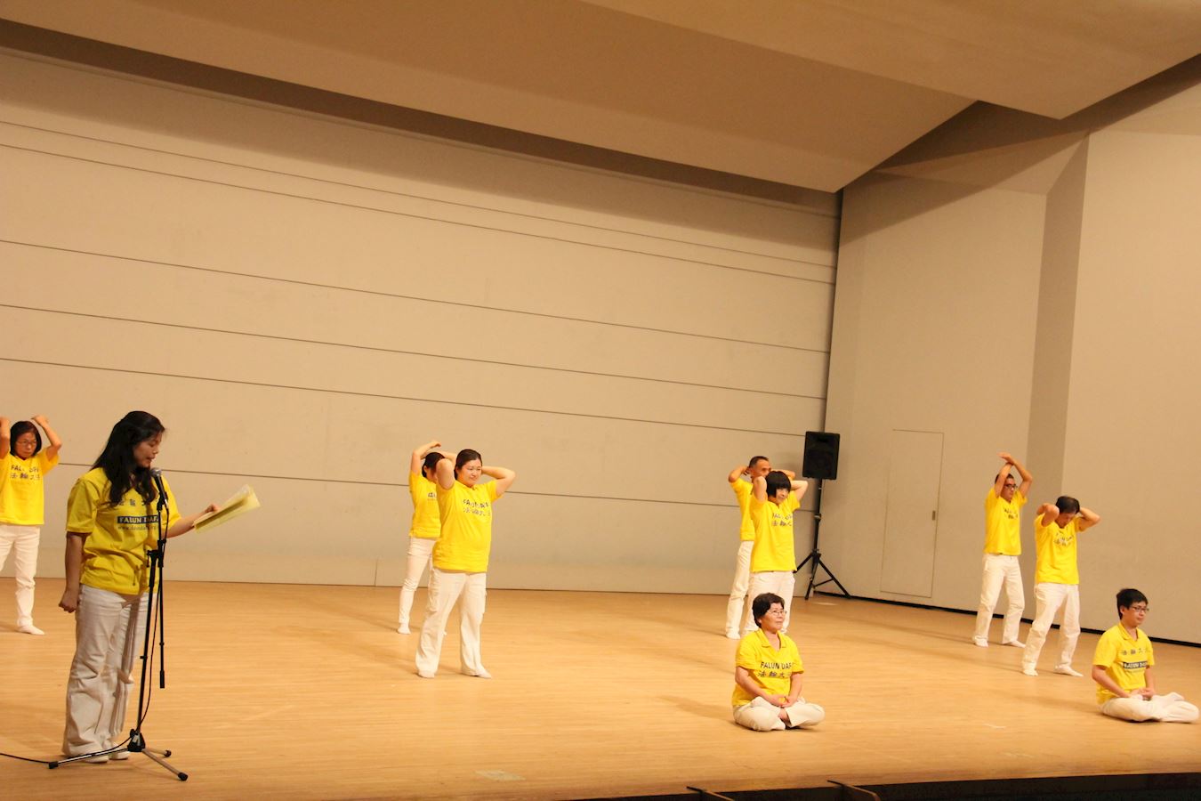 演出时,舞台上的法轮功学员祥和、健康,充满着正的能量。法轮功的动作舒缓、简单,伴随着悦耳的炼功音乐,所有在场的观众被法轮功所吸引,不约而同地学炼了起来。