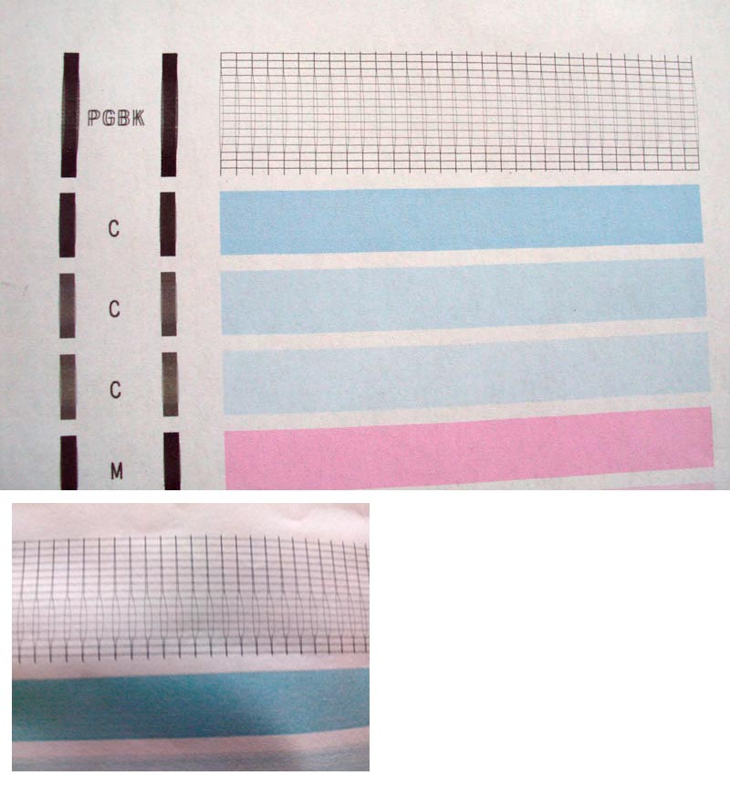 据反馈,佳能新型喷墨机(包括iP7280/iP8780/iX6780/MG5480等)的一个常见故障表现为:打印出的文字重影,喷嘴检查图案大黑部分有纵向弧形双线,简称“双线”,效果见图示: