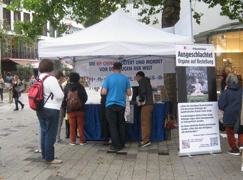 ![]() 图1:汉诺威市中心的真相展位,旁边竖立着的横幅印着今年二月德国电视台3sat播放的关于中共活摘法轮功学员器官的纪录片告示。 |