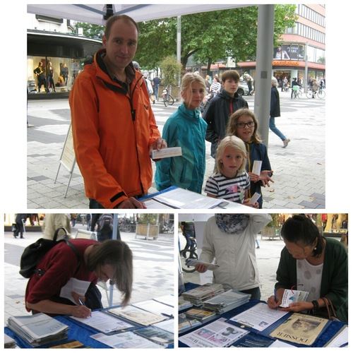还有一位年长的德国老人,从一九九二年法轮功在中国开始洪传时,就听说过法轮功。他曾在业余大学担任校长,后来在大学教书,几十年来一直对世界文化感兴趣,特别以“洗脑”为主题做过研究。他问学员:“中共为什么要迫害法轮功?”法轮功学员给他讲了真相后,他立刻在征签表上签了字。