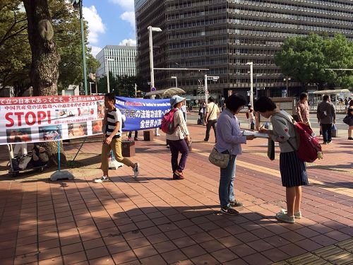 日本爱知县法轮功学员也借此机会在名古屋市(Nagoya,Aichi-Prov.)最繁华地段的“荣”(Sakae)举办了反迫害、揭露中共活摘法轮功学员器官的暴行、声援全球控告江泽民的签名活动,两天时间大概得到了近千人的签名。