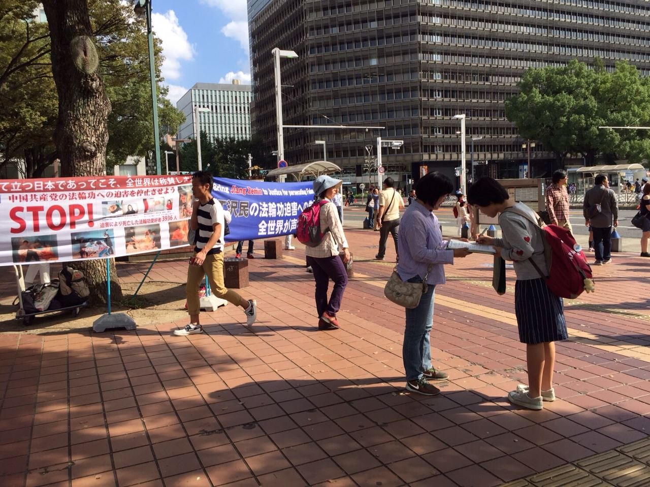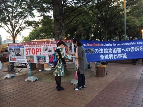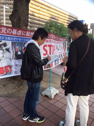 有很多日本人看了横幅之后,才知道在中国现在还有如此惨无人道的活摘法轮功学员器官的事发生,感到非常震惊。有一位准备过几天做手术的老人,用颤抖的手签了自己的名字。有的市民在签了字后说:“加油啊!”