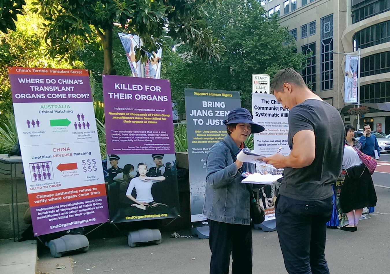 Brianna Stephenson是悉尼大学媒体和通信学系的一名学生,她同时也在附近上班,她告诉学员她已经将活摘器官作为她的新闻说明会的课业来做。她说:“我在附近上班,每天走过这里很多次,每次都看到你们。有一天我觉得应该停下来看看到底发生了什么事情。我向一名叫艾丽森的学员介绍了自己,问她‘您是否希望我捐些钱,或是别的什么?’她说‘不,不’,并递给我一个法轮大法的传单。我开始阅读这个传单,看到活摘器官的事情,我内心不由自主地生出恐惧,真的不敢相信。回去后我做了一些调研,开始我以为这件事会很快就过去,淡忘掉。然而越往下做就越想做,因为无法相信在当今的社会会发生这样的事情,当我确认这一切真的在发生的时候,那种心情无法言表。”“当这样的事情发生的时候,你怎么可能无动于衷,怎么能不做点什么来改变这个现状?我会尽力让更多人知道这件事情,也许不会一下子触及到很多人,但是人传人就会传开。”