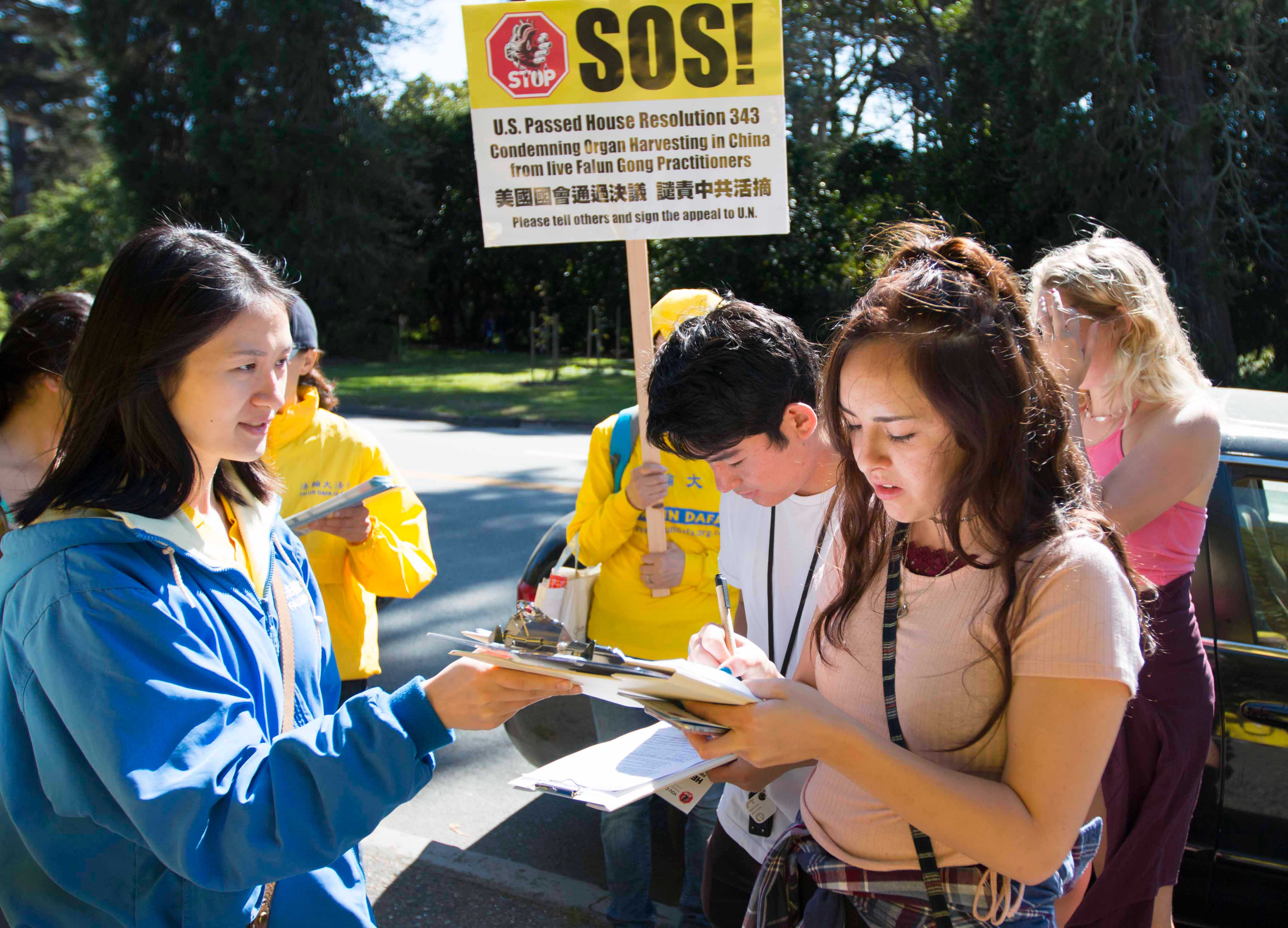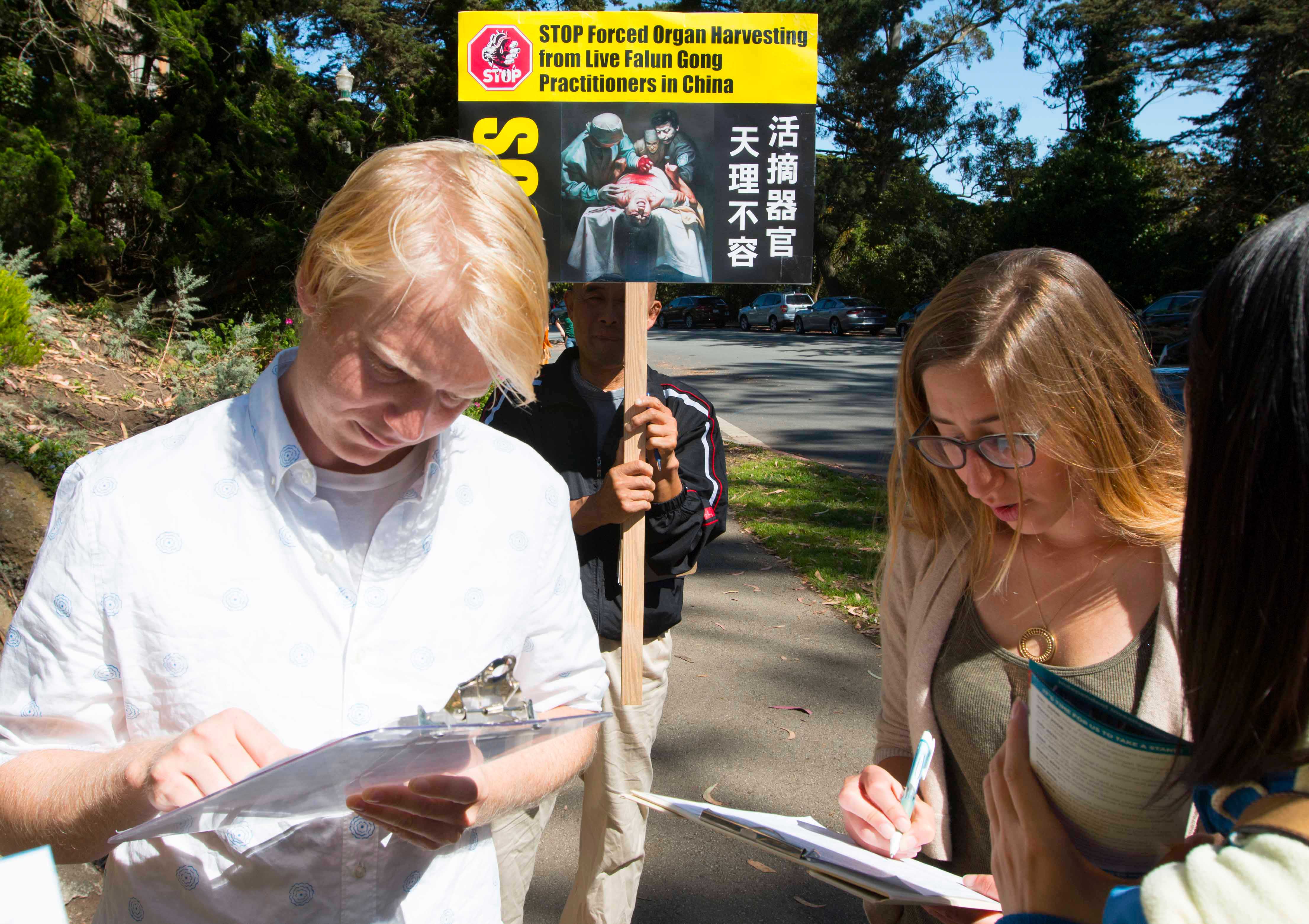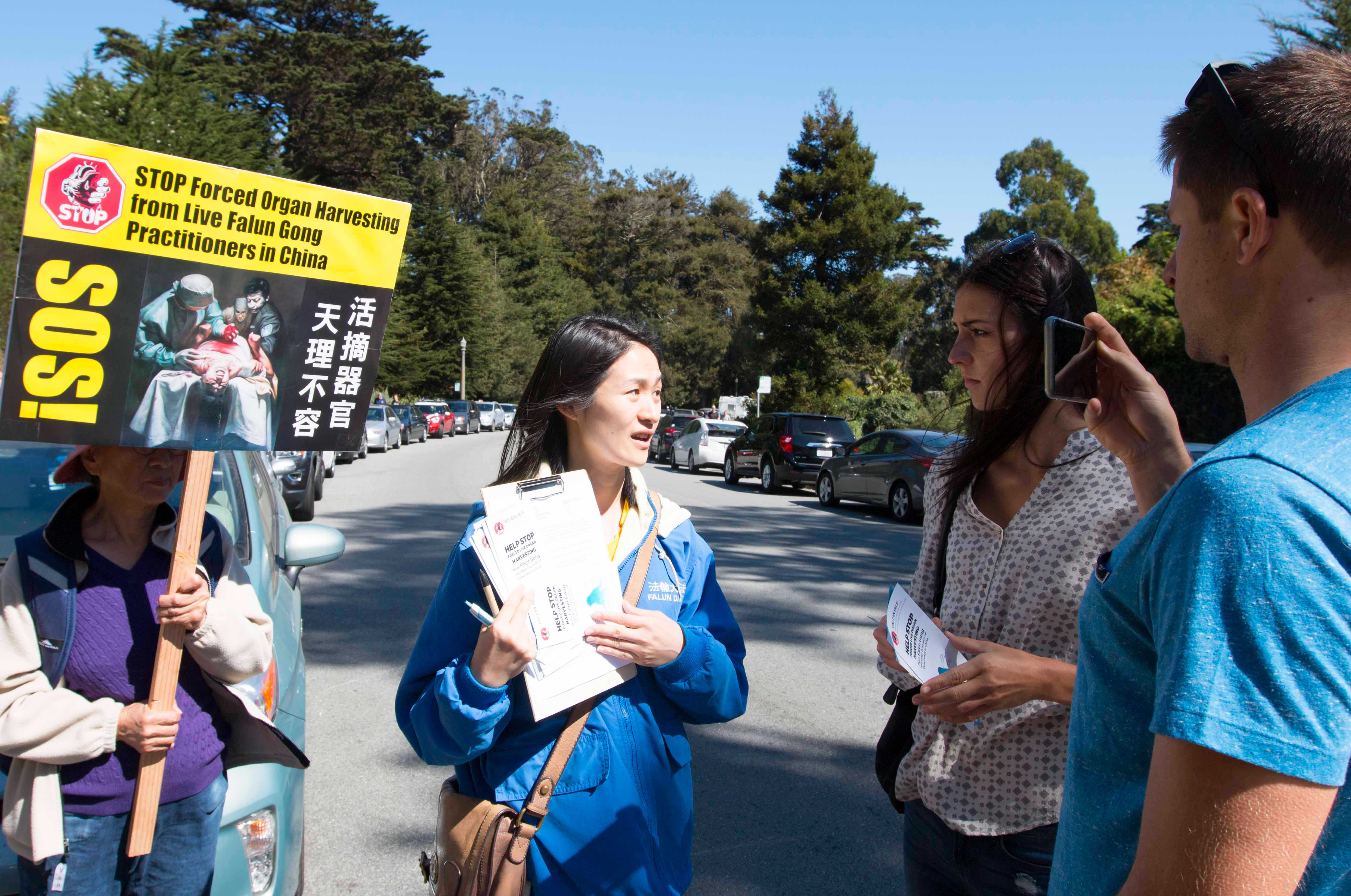 当天上午,数百名法轮功学员在市中心联合国广场集体炼功后,以十几名学员为一组,分散在旧金山的各个景点和街道讲真相。他们有的举着展板,有的向路人派发真相资料,有的讲真相征集签名。他们手中的展板上写着:“活摘器官,天理不容”、“制止中共活摘法轮功学员器官”。