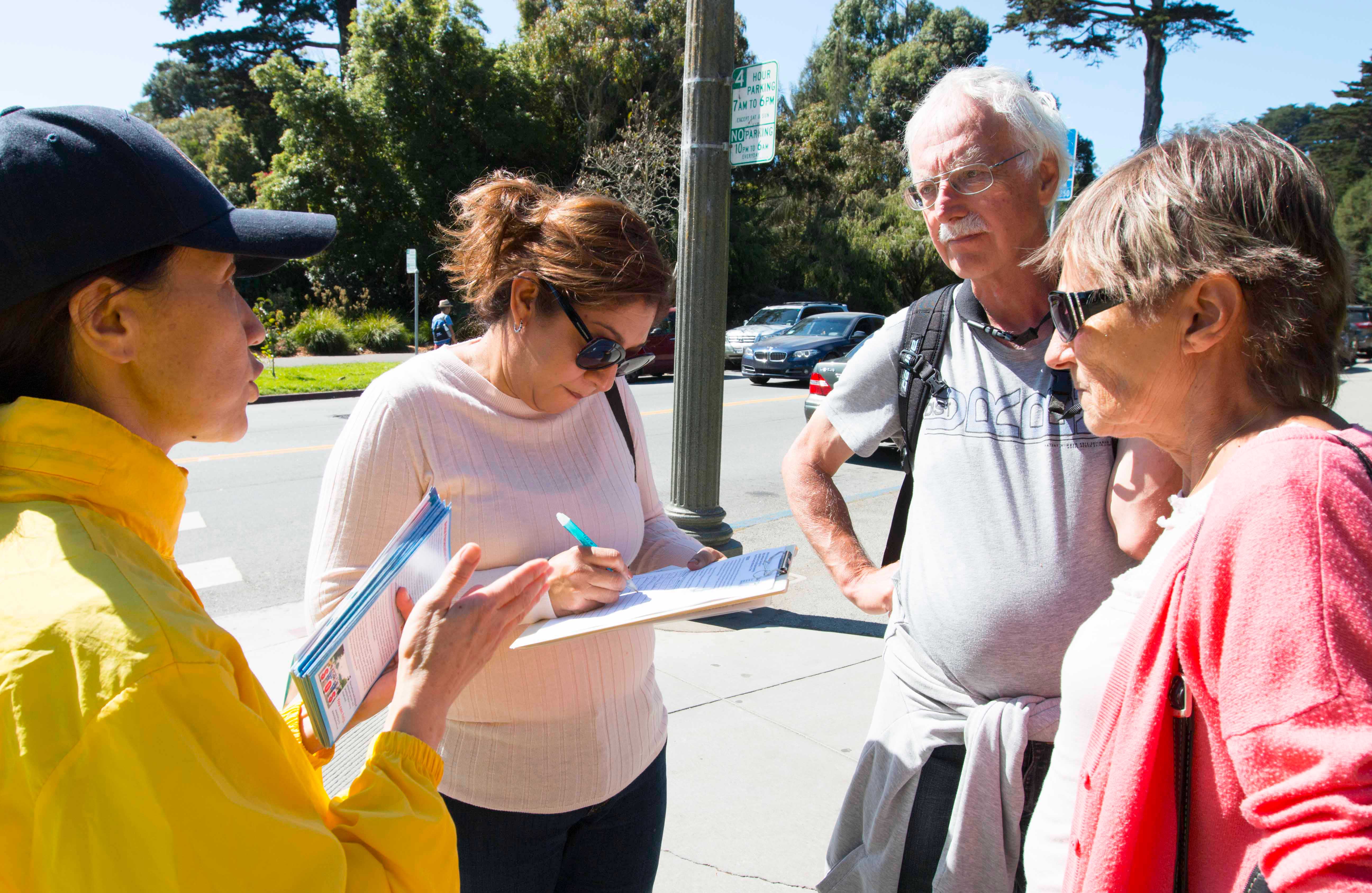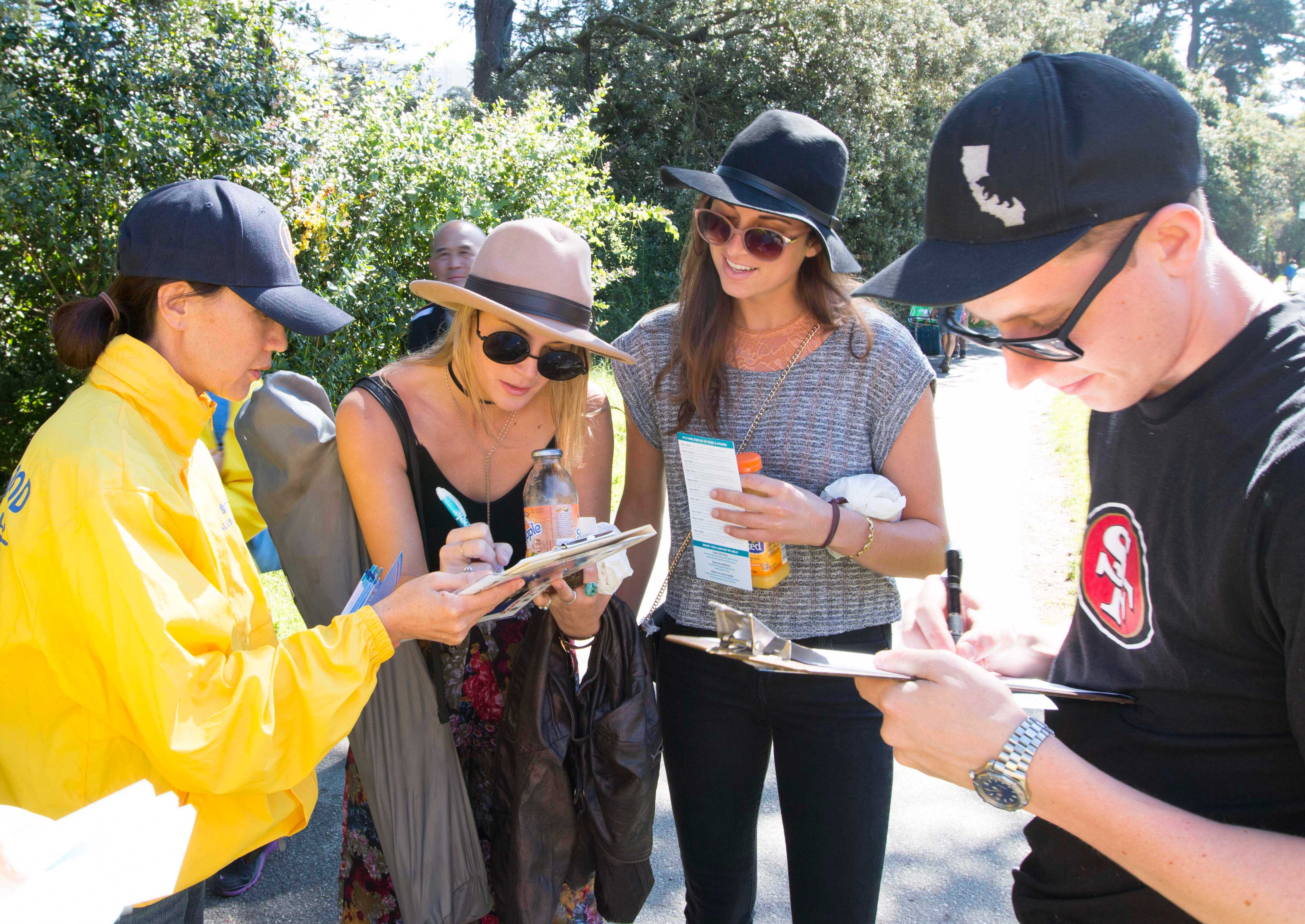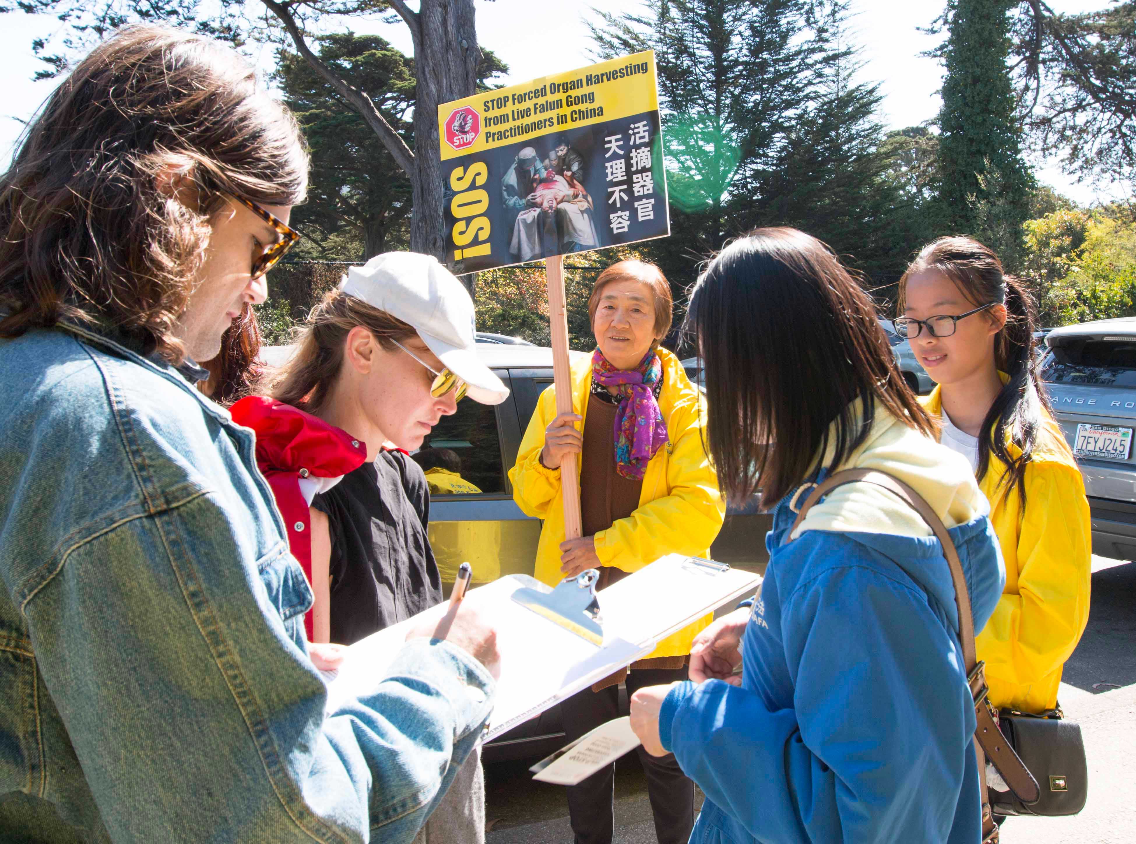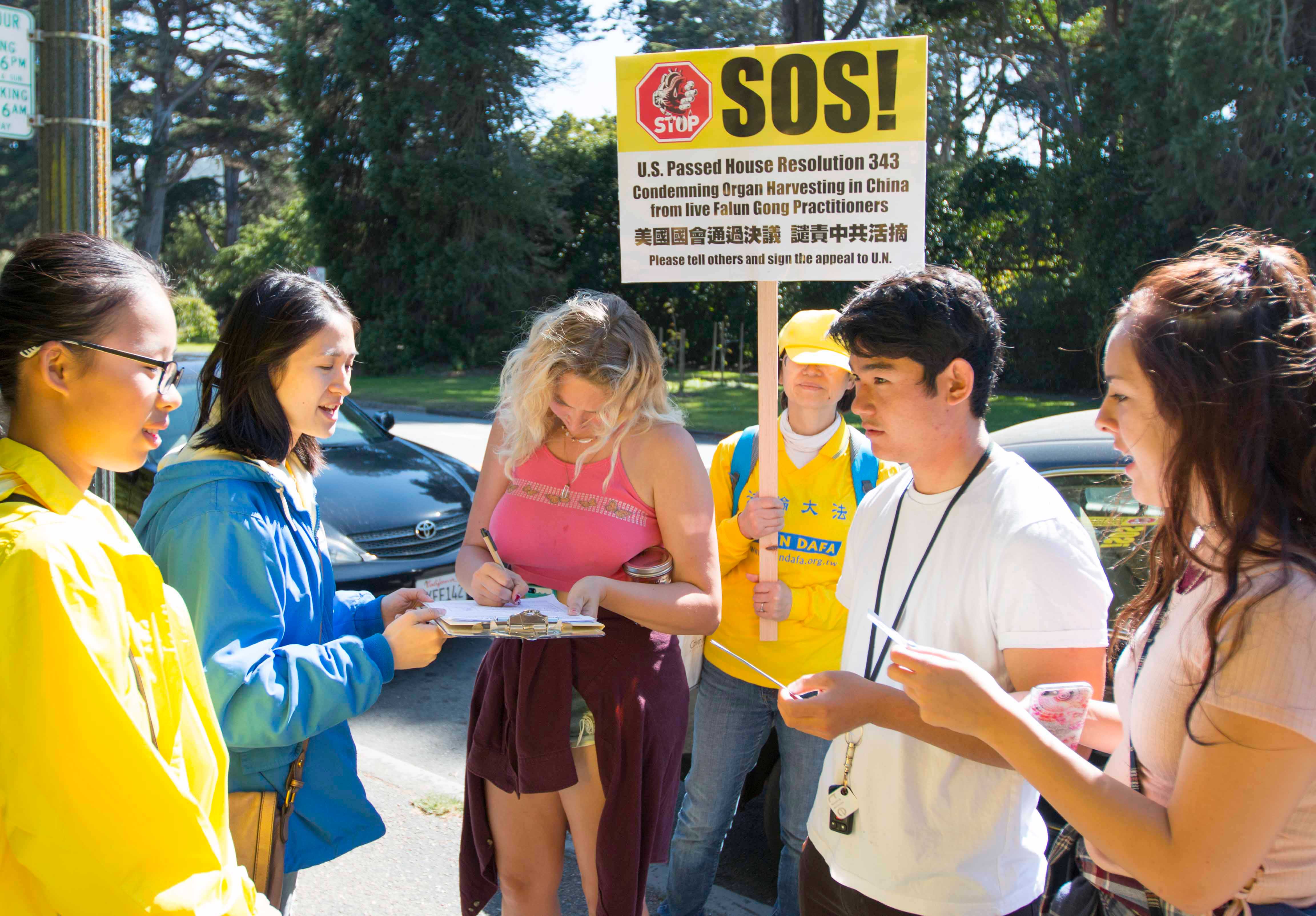 当天上午,数百名法轮功学员在市中心联合国广场集体炼功后,以十几名学员为一组,分散在旧金山的各个景点和街道讲真相。他们有的举着展板,有的向路人派发真相资料,有的讲真相征集签名。他们手中的展板上写着:“活摘器官,天理不容”、“制止中共活摘法轮功学员器官”。