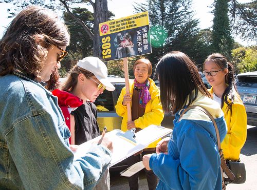 星期六的旧金山,阳光明媚,许多人在金门大桥公园散步,他们看到真相展板,主动找法轮功学员询问真相。他们对中共活体摘取法轮功学员器官的暴行表示震惊和愤慨。他们表示,如果这些是真实的,中共太邪恶了,太恐怖了。不能因为人的信仰,就进行迫害,将人杀死。