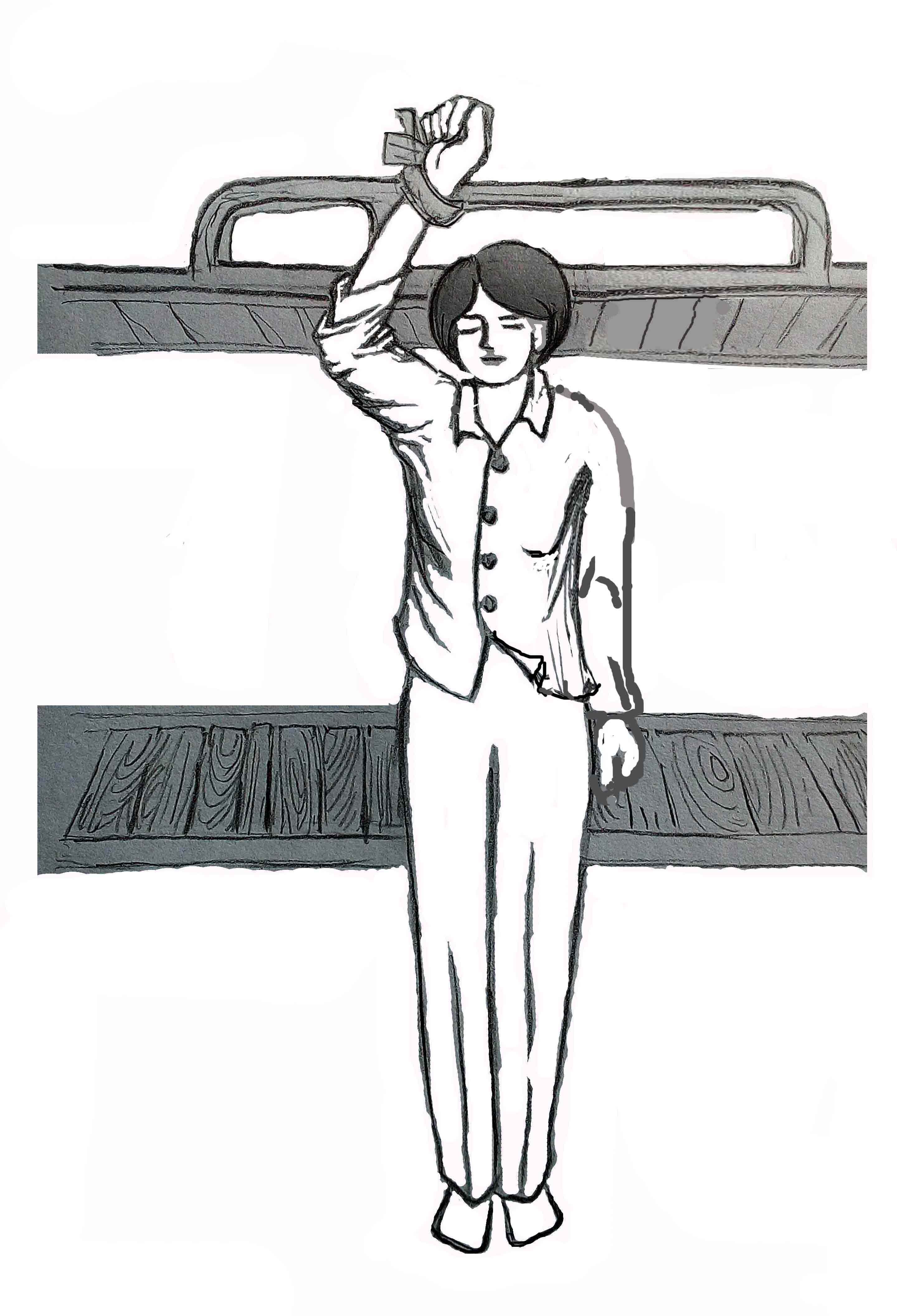 在看守所期间,她只能天天躺着,上厕所时由三人架着去,生活不能自理,右大腿外侧肌肉变形,象扣了个碗一样突着,即使这样还被非法关押了一个月。最后劳教一年(因偏瘫症状,劳教未成)。