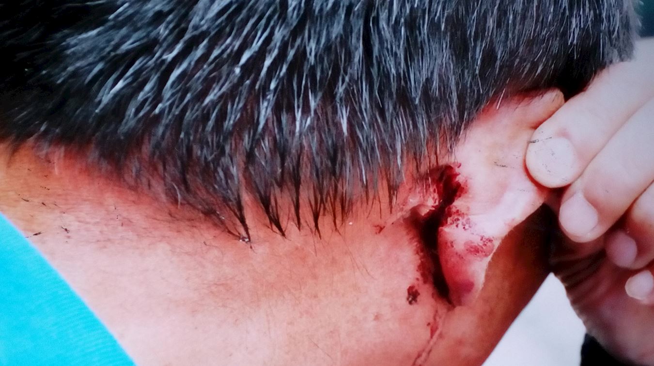 其中一名三十多岁的警察不知何时从派出所里拿出一并瓶不明液体药物,对着廖邦贵老人就喷,廖邦贵下意识的把头一偏,药物没有喷到眼里、脸上,却喷到了右耳根上,顿时感到奇痒无比,灼痛难忍,他忙用纸巾一擦,鲜血直往外流。