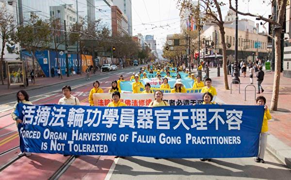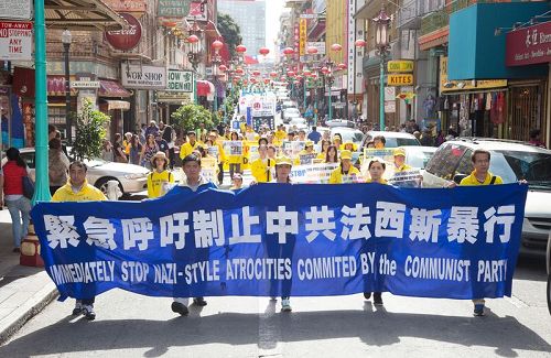 【明慧网二零一六年十月二十三日】(明慧记者李欣慈、英梓旧金山采访报道)二零一六年十月二十二日,在美国旧金山市中心繁华的大道上,很多中西方游客们被一场盛大的游行所震撼。约四千名法轮功学员以壮观的队伍、和平理性的精神面貌吸引着人们。许多观众为法轮功学员炼功方队祥和的能量所感染,同时也为中共超出人类道德底线的迫害、活摘法轮功学员器官的罪恶所震惊。“制止活摘器官、终止迫害”——这是有正义良知的人们共同的呼声。