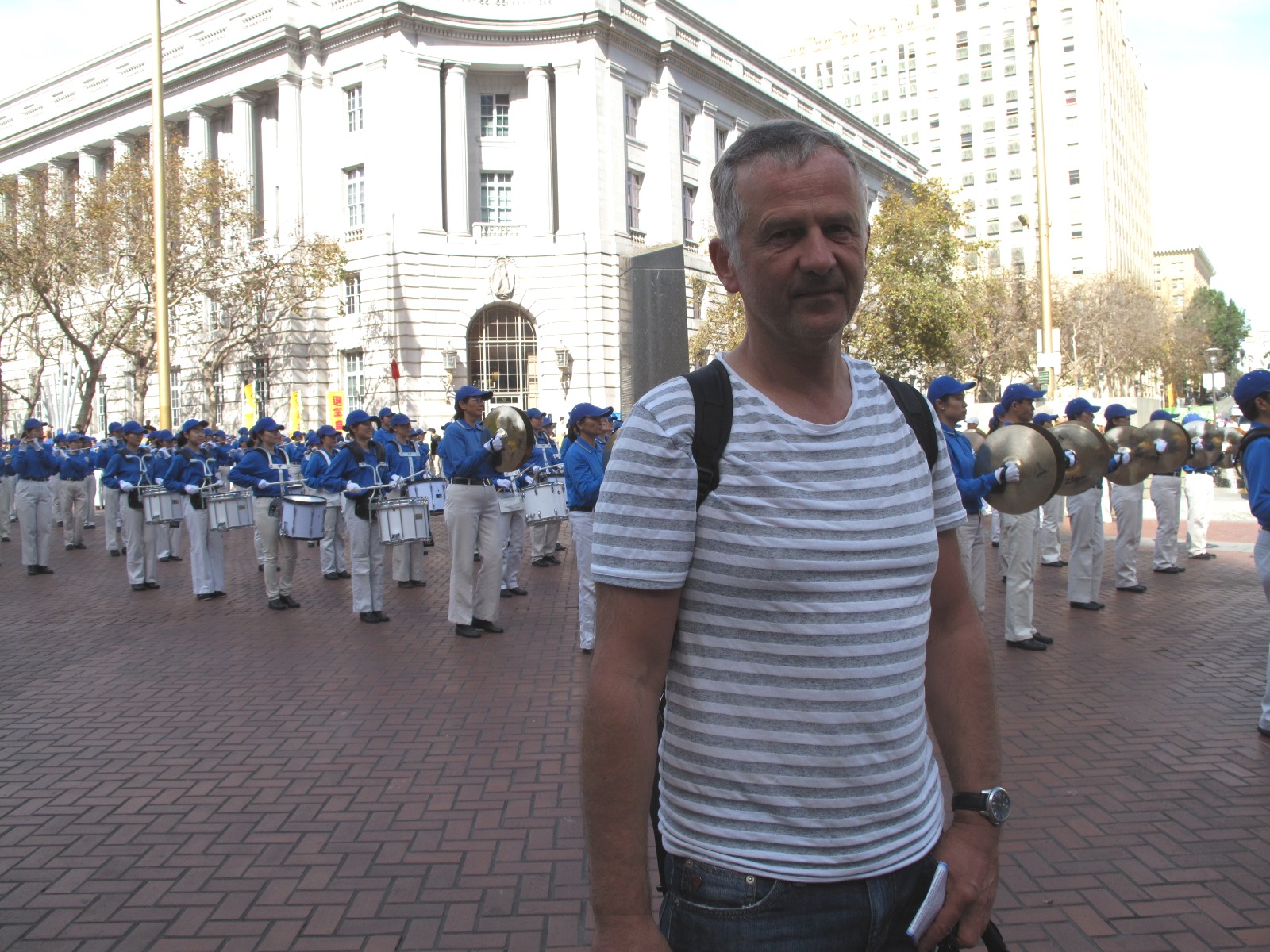 游行队伍还没出发,来自德国的工业领导力教练(industrial leadership coach)约翰(Joh Hanaas)被正在原地演奏的天国乐团吸引,驻足观看。约翰来自德国科隆,知道法轮功,因为他在科隆大教堂前经常看到在那里讲真相的法轮功学员,并曾签名谴责中共活摘器官的罪行。