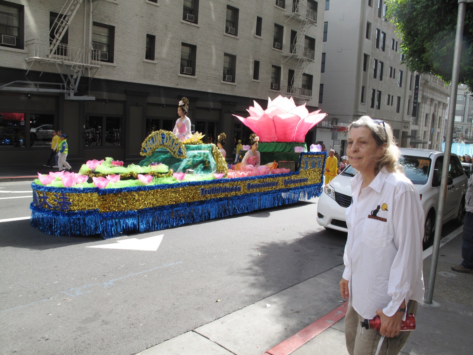 玛丽告诉法轮功学员,这是她在旧金山第三次看到法轮功学员的游行,今天当她听到(天国乐团的)音乐后,马上意识到是法轮功,于是她高兴地跑到街头来观看。她希望法轮功学员继续坚持下去。