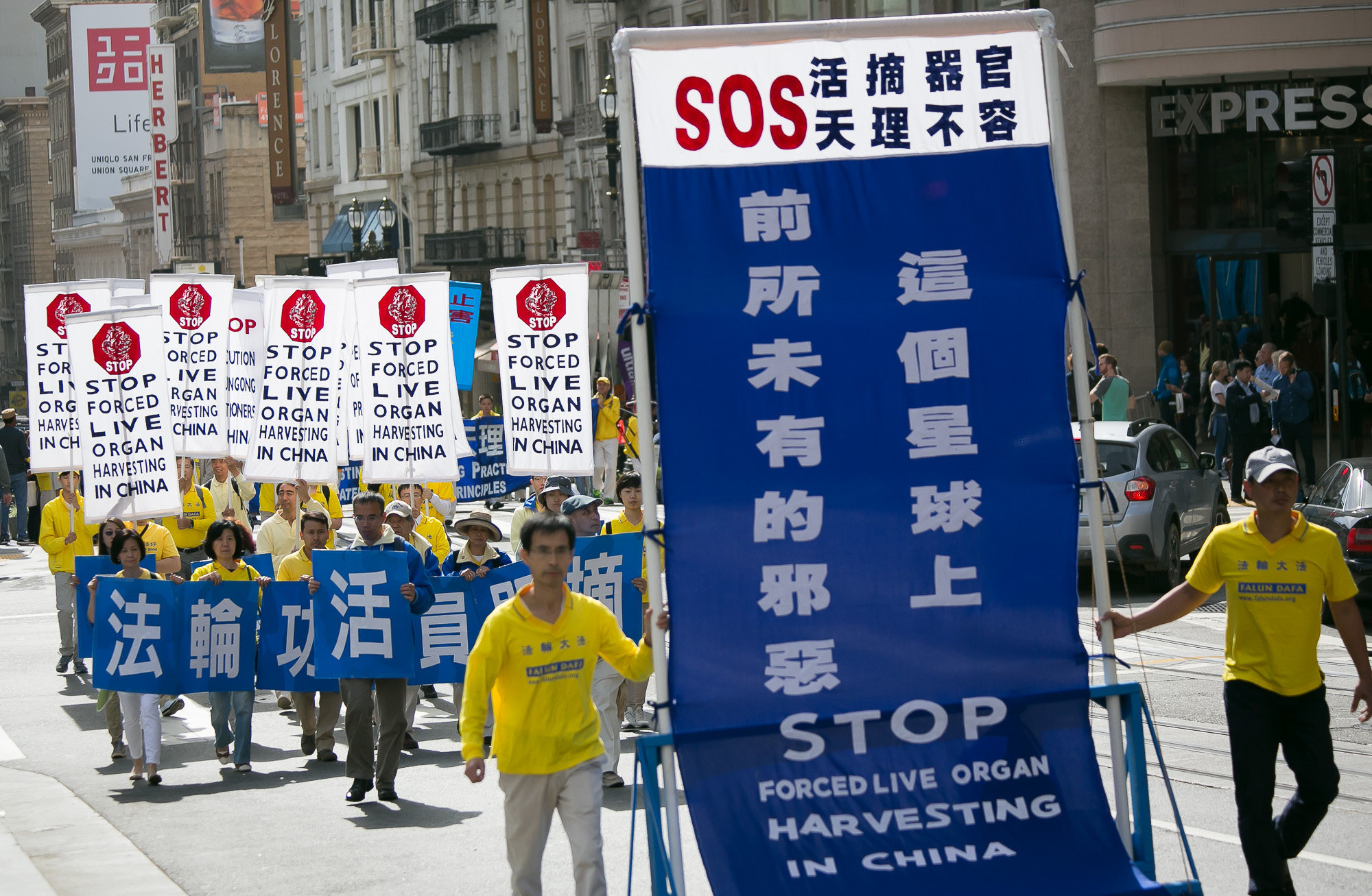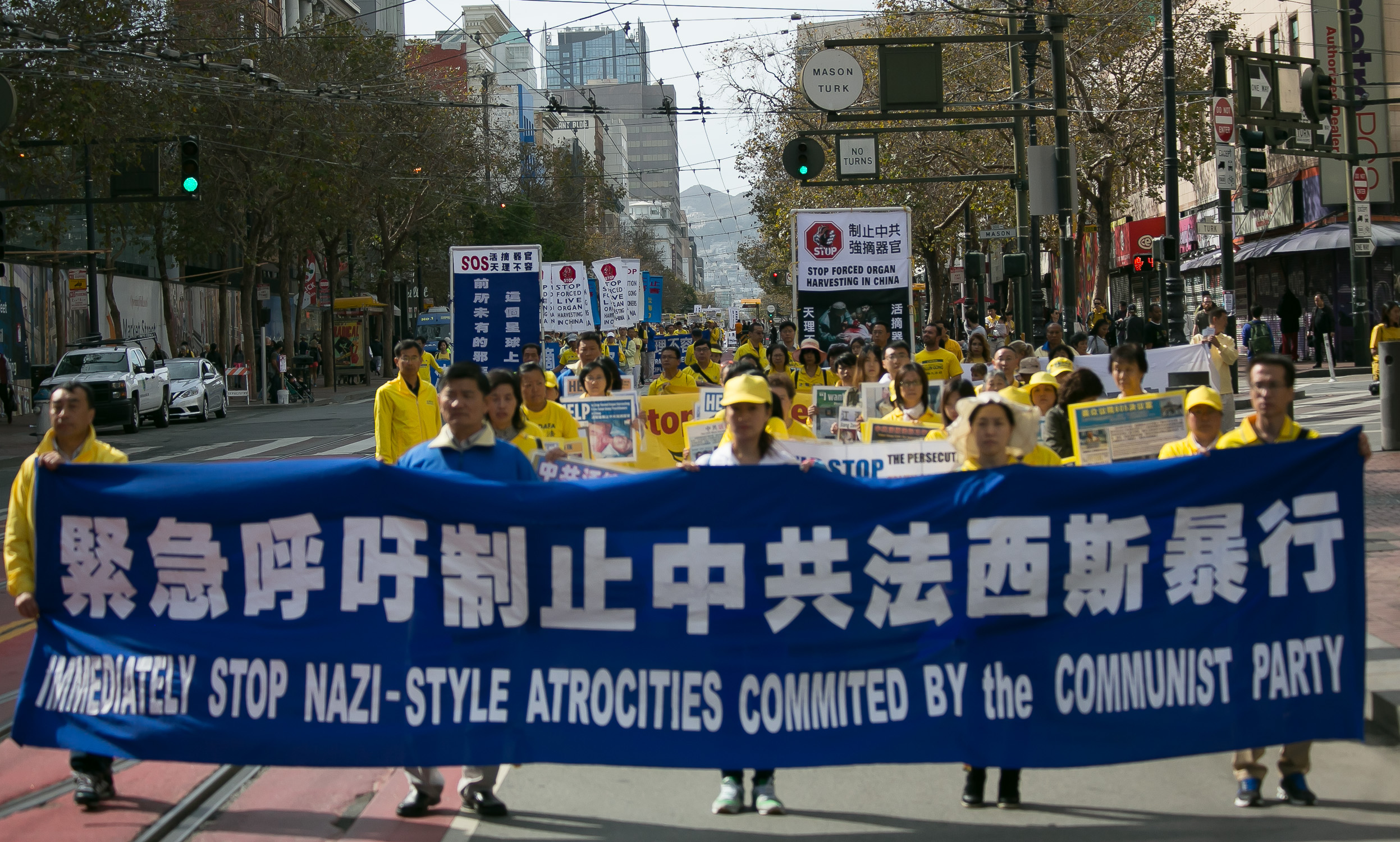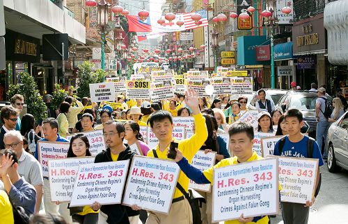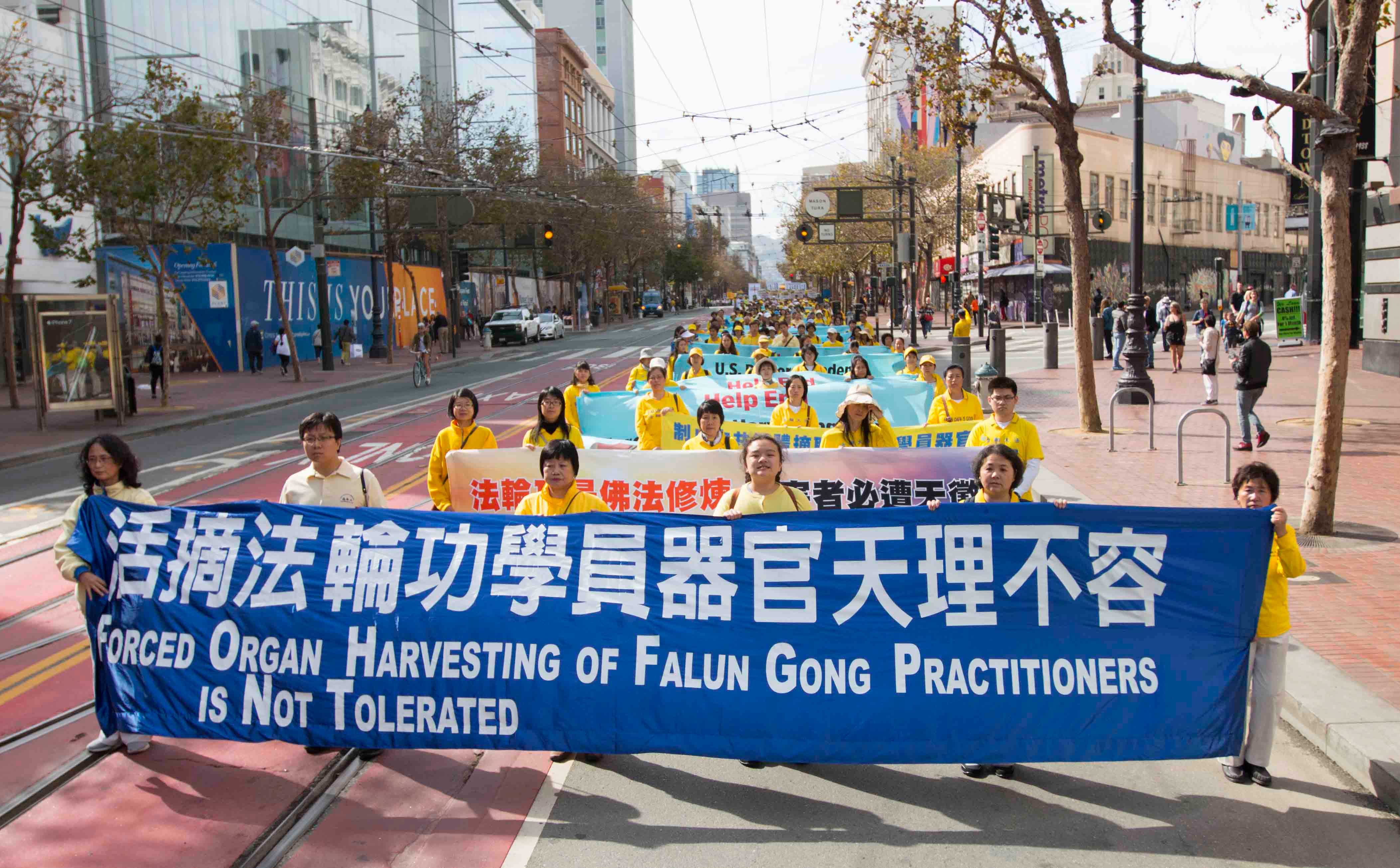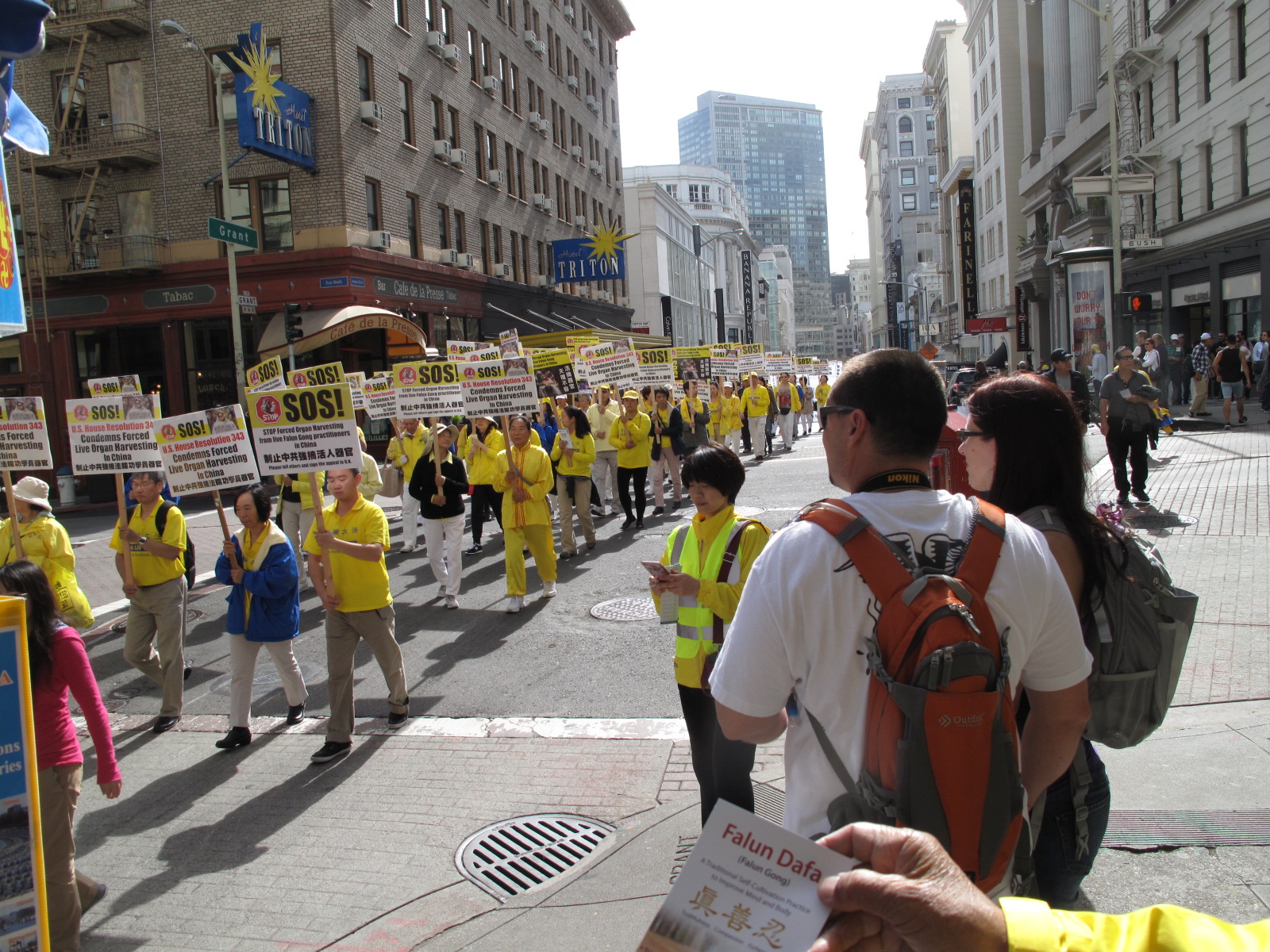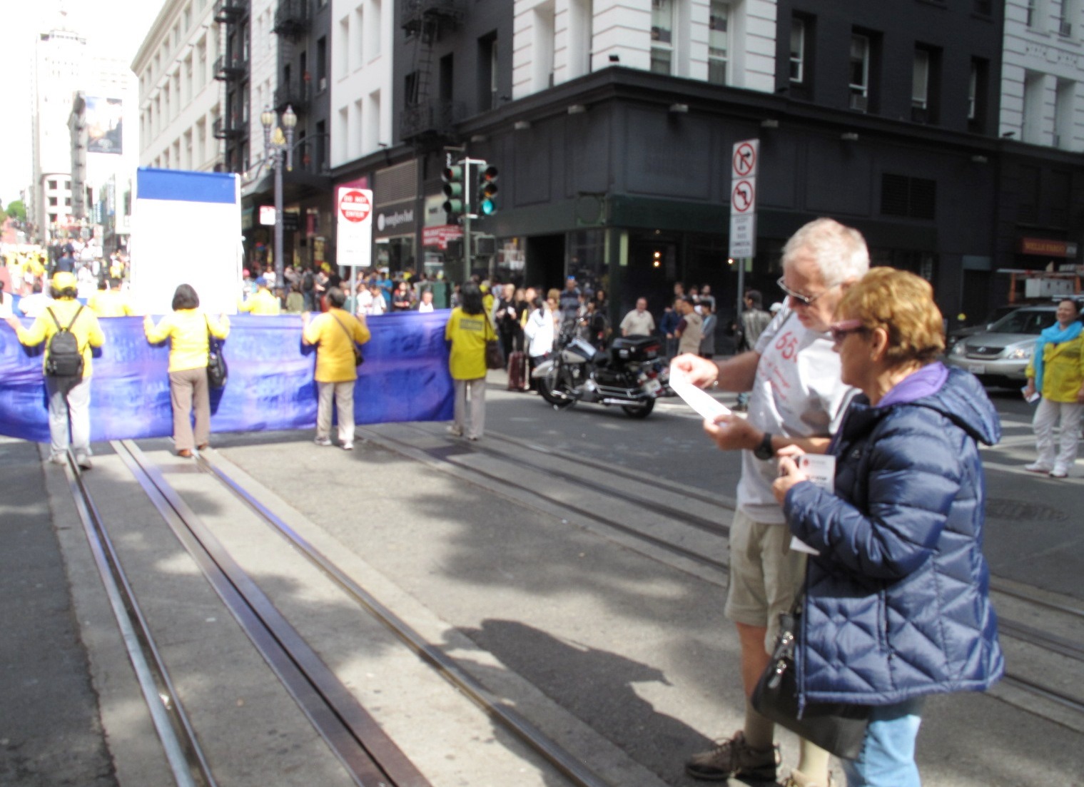 队伍行经旧金山著名的商业区联合广场以及华人店家林立的唐人街,很多来自世界各地的游客都幸运地成为法轮功游行的观众,还有很多沿街中外店家里的工作人员也被天国乐团的音乐吸引出来。他们接过传单认真阅读,一些人们停下脚步与法轮功学员深入交谈。了解真相的人们无不赞美法轮大法的美好,很多人被中共活摘法轮功学员器官的暴行所震惊,纷纷强烈谴责。