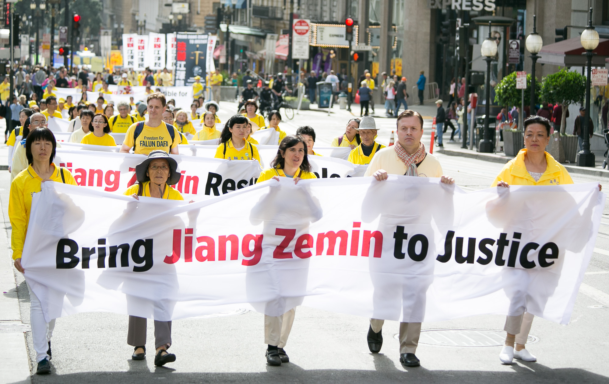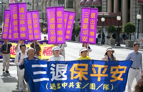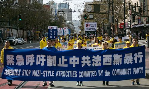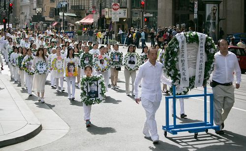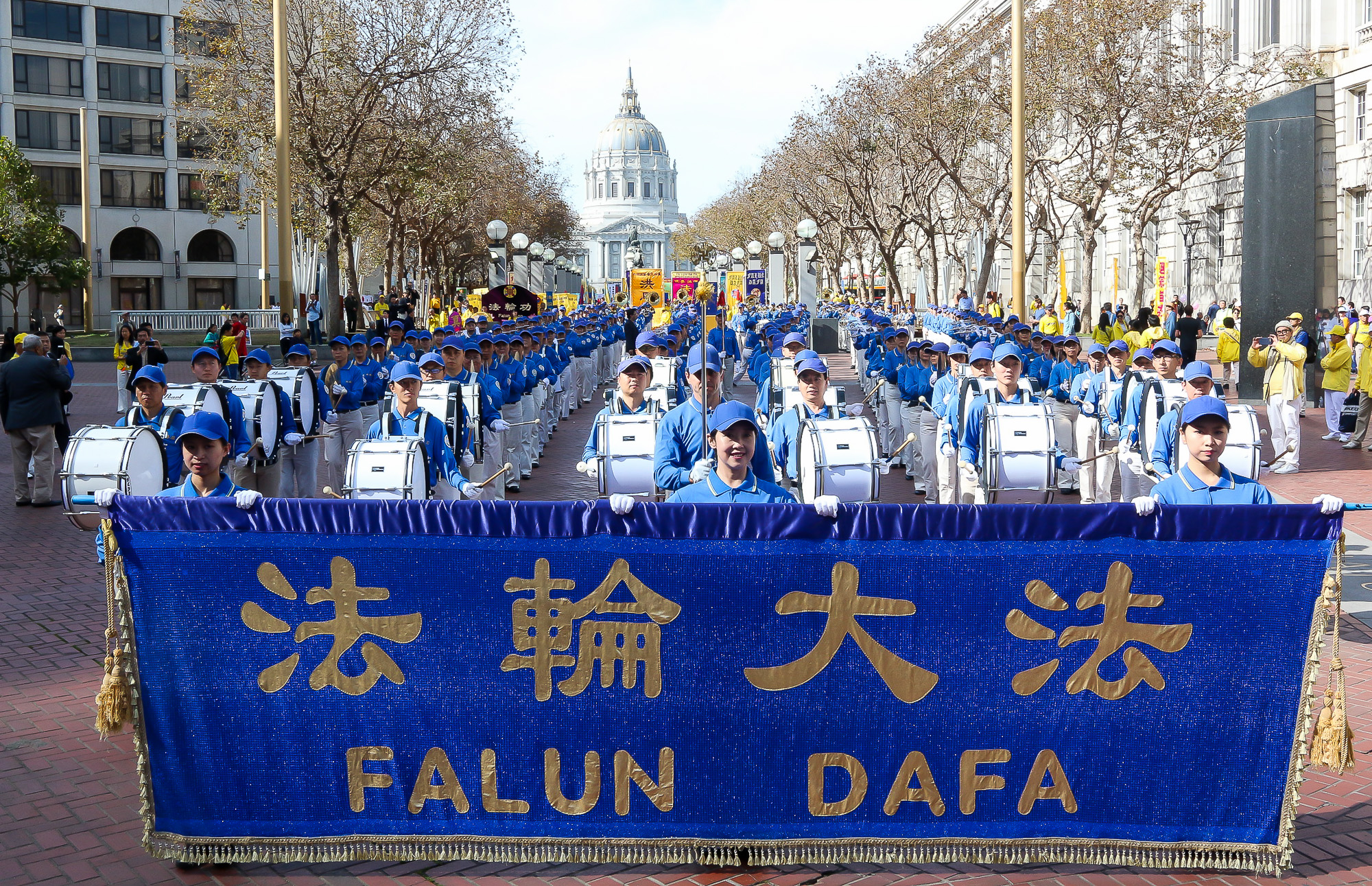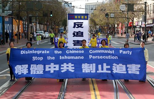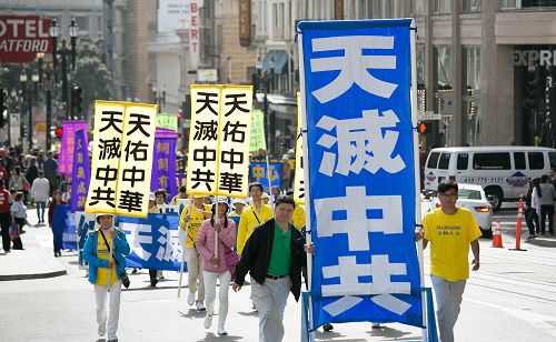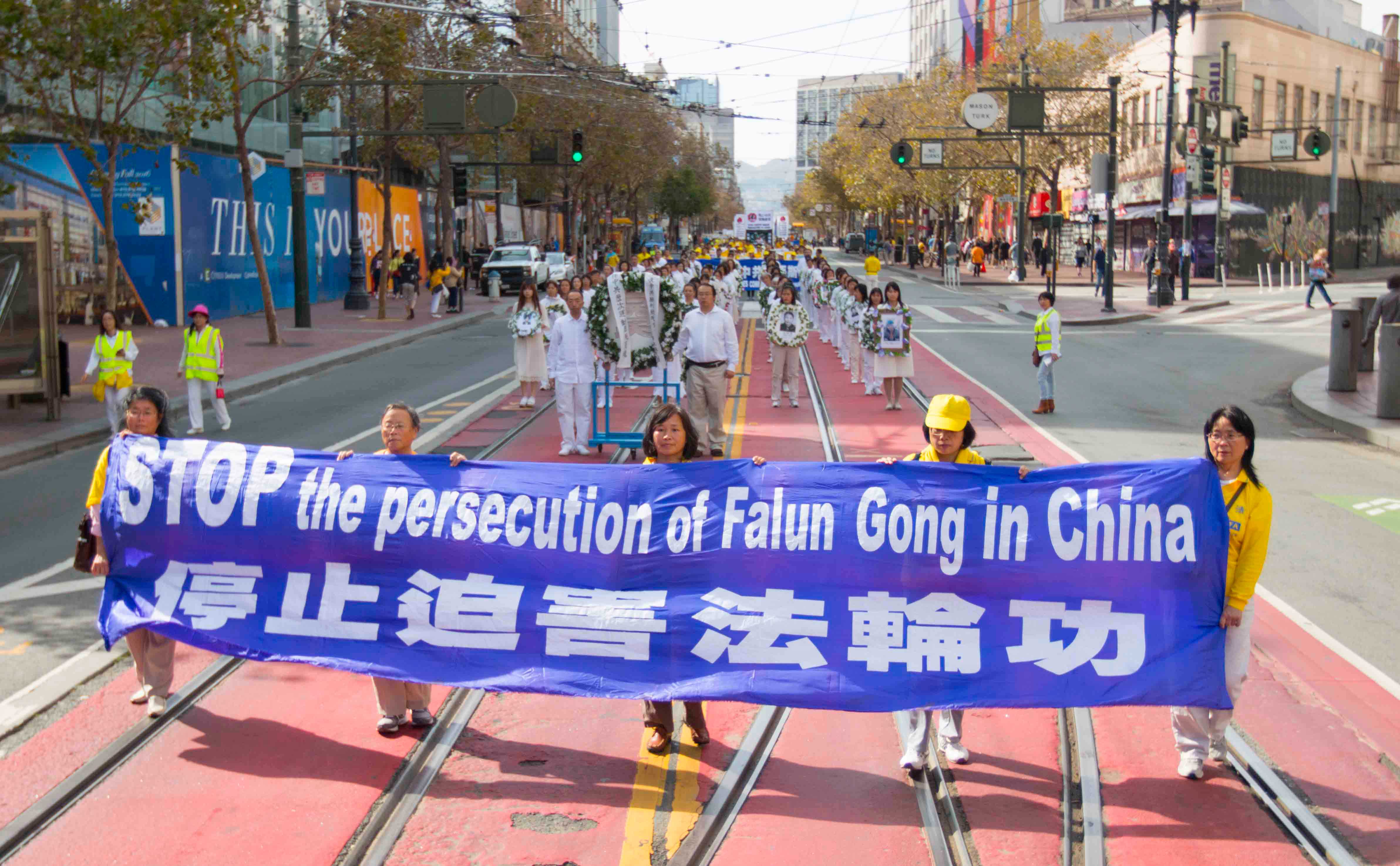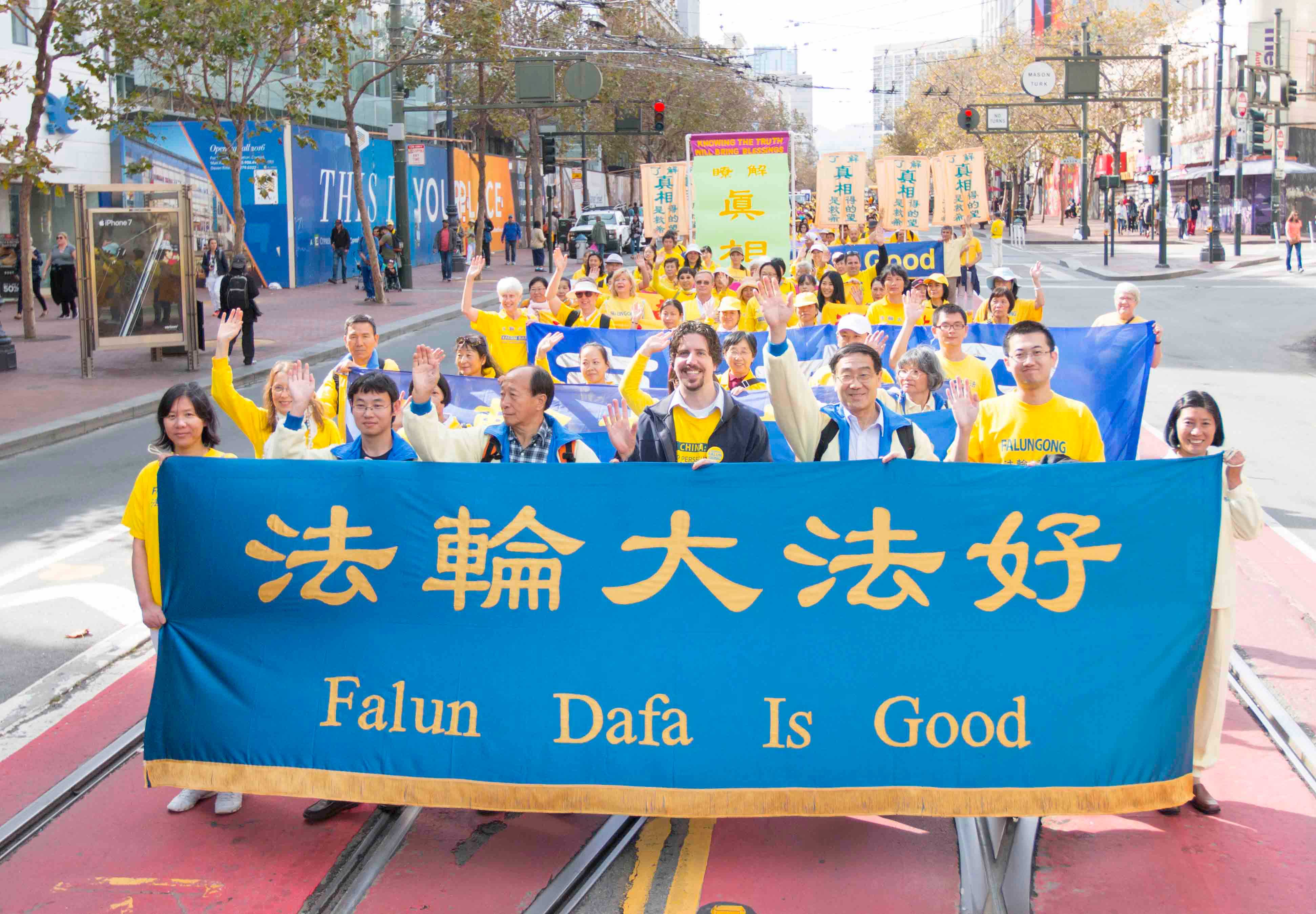 游行前,法轮功学员在位于旧金山市政大厅附近的联合国广场(UN Plaza)举行了集体炼功。上午十一时三十分,在警察的护卫开道下,规模浩大的游行队伍从联合国广场出发,途经市中心的商业区和唐人街主要街道,最后在花园角公园结束。