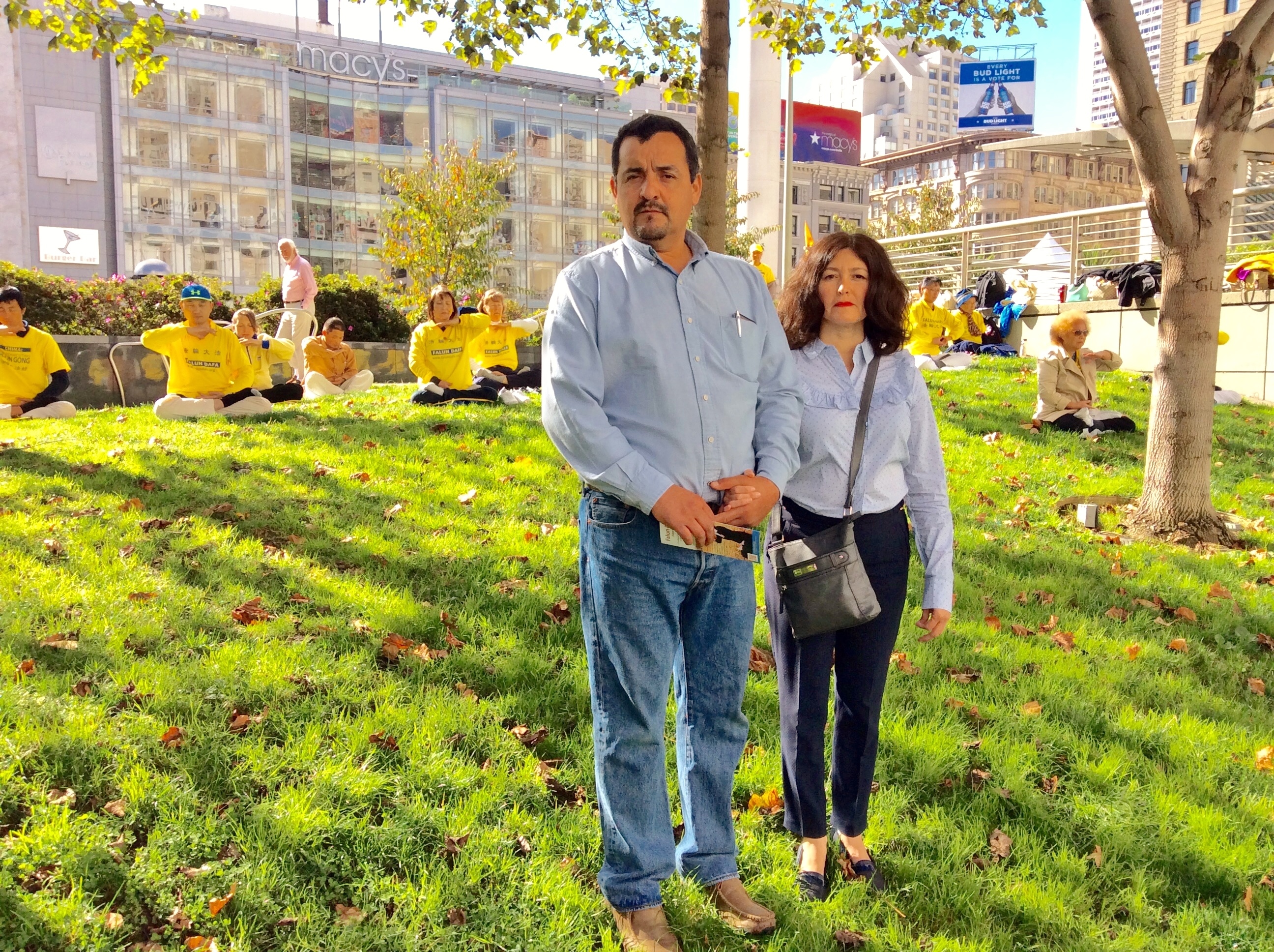商人塞给•夫南克(Sergio Franco)与太太路过邮政大街(Post Street)的真相点,被学员打坐的宁静气氛所吸引。他以前听说过法轮功,并表示自己非常认同法 轮功,认为法轮功能够使人强身健体,有着平静的心灵,他也知道中共活摘器官的罪行,并毫不犹豫在征签表上签名支持法轮功。
