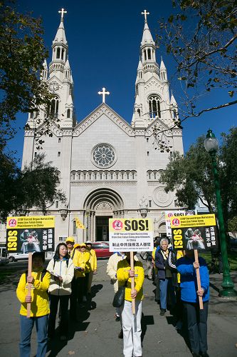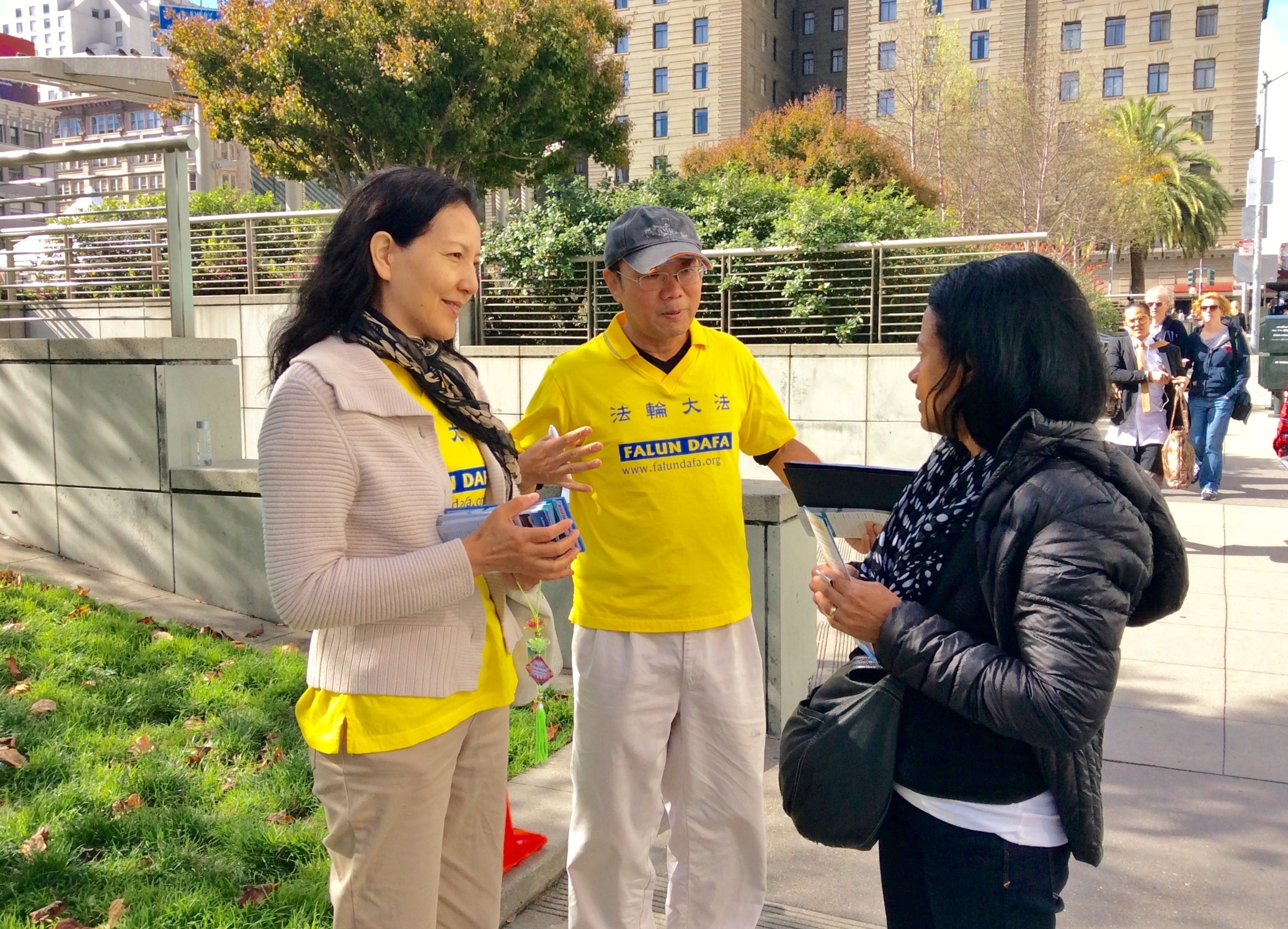 十月二十三日,美西法轮大法修炼心得交流会召开前夕,二千多名法轮功学员分布在旧金山市四十六个公园、广场和地标景点展开讲真相活动,如同到处开放的“真相之花”。学员以几十人为一组集体炼功,明亮的黄色T恤,缓慢、优美的功法,城市的喧闹无法影响到他们内心的宁静。还有一些学员,手持“制止中共活摘法轮功学员器官”的横幅游行,醒目的信息吸引着市民及游客,不少进一步了解详细信息。