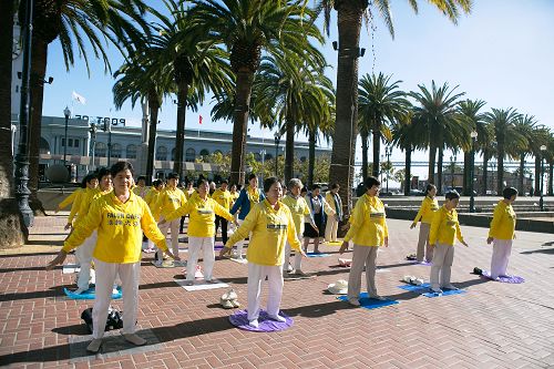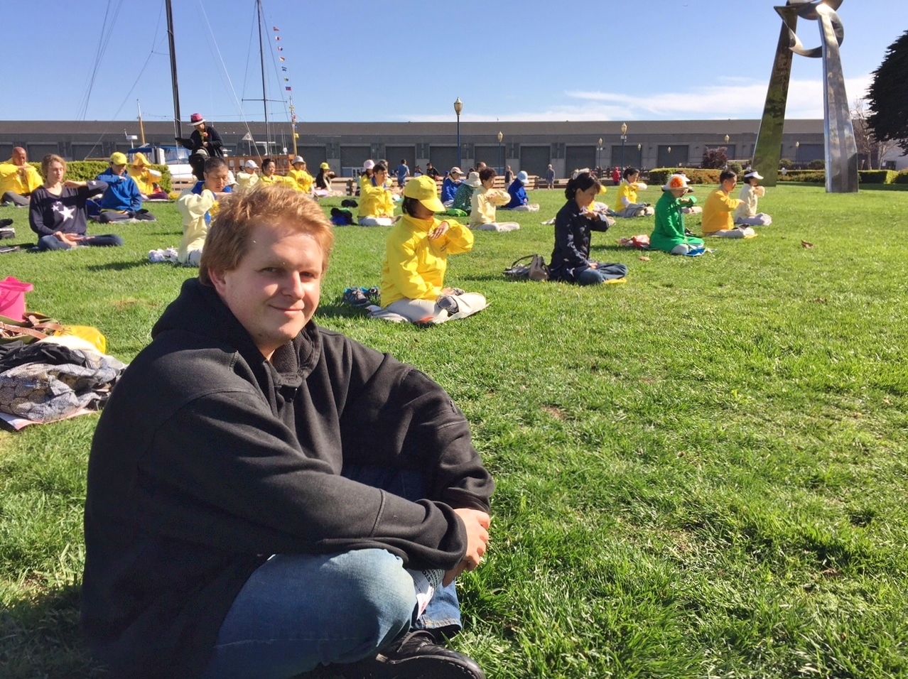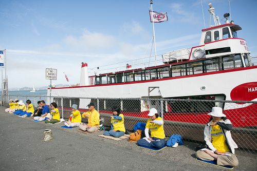 渔人码头的工作人员崔维斯•布鲁克(Travis Brokaw)坐在炼功的学员们旁边,安静地看着。他说:“我在上班的途中,看到这里每一个人都那么安宁祥和,深受触动。我的意思是,你看整个城市多么嘈杂,我刚刚坐了一个小时的车来到这里,真的很想让自己静一静。我看到他们了,就坐下来,片刻就静下来了,让我精神集中,却很放松,似乎让我立刻远离尘嚣,我非常享受这难得的安宁。听到中国发生(活摘器官)的事情,太让人震惊。我下班后一定会去认真查看。但我真的非常喜欢这个功法,我早些年曾经学过打坐,这个功法让我很感兴趣。”