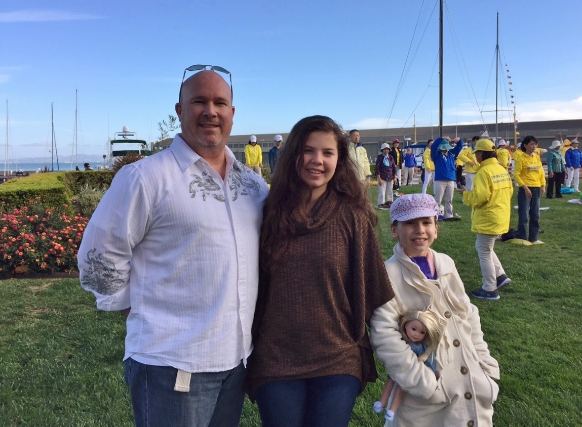 马修(Matthew)是一名福利顾问,因今天是小女儿的生日,他带着两个女儿到渔人码头玩,看到一群学员们正在炼功,就停下来观看。他对学员说:“我一直对(法轮功)挺感兴趣,并受到启发想了解更多,想知道他如何影响人。非常感谢你们,感谢你们花时间介绍给我。”马修表示回去以后会更多地了解法轮功。