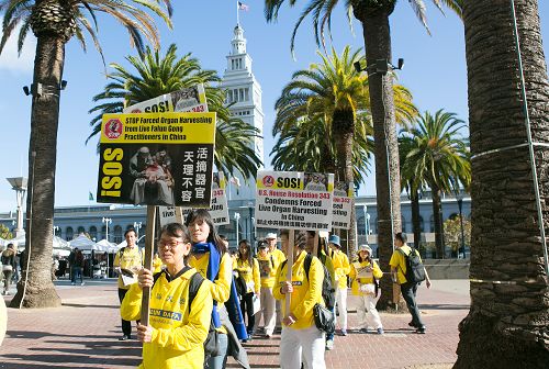 ![]() 图4-6:二零一六年十月二十三日,二千名法轮功学员分散在旧金山的各景点、商业街举办小游行,揭露中共活摘法轮功学员器官的罪恶,并征集签名呼吁帮助制止迫害。 |