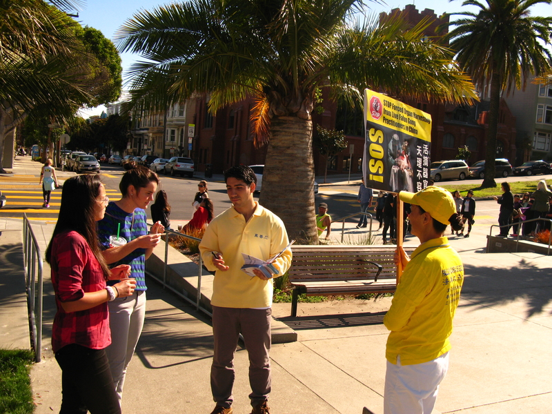 一位来自中国的游客在旧金山只呆一天,没想到遇见了法轮功。之前,他听说过法轮功被迫害的事情,学员问他是否愿意签名支持法轮功,他随即签名。
