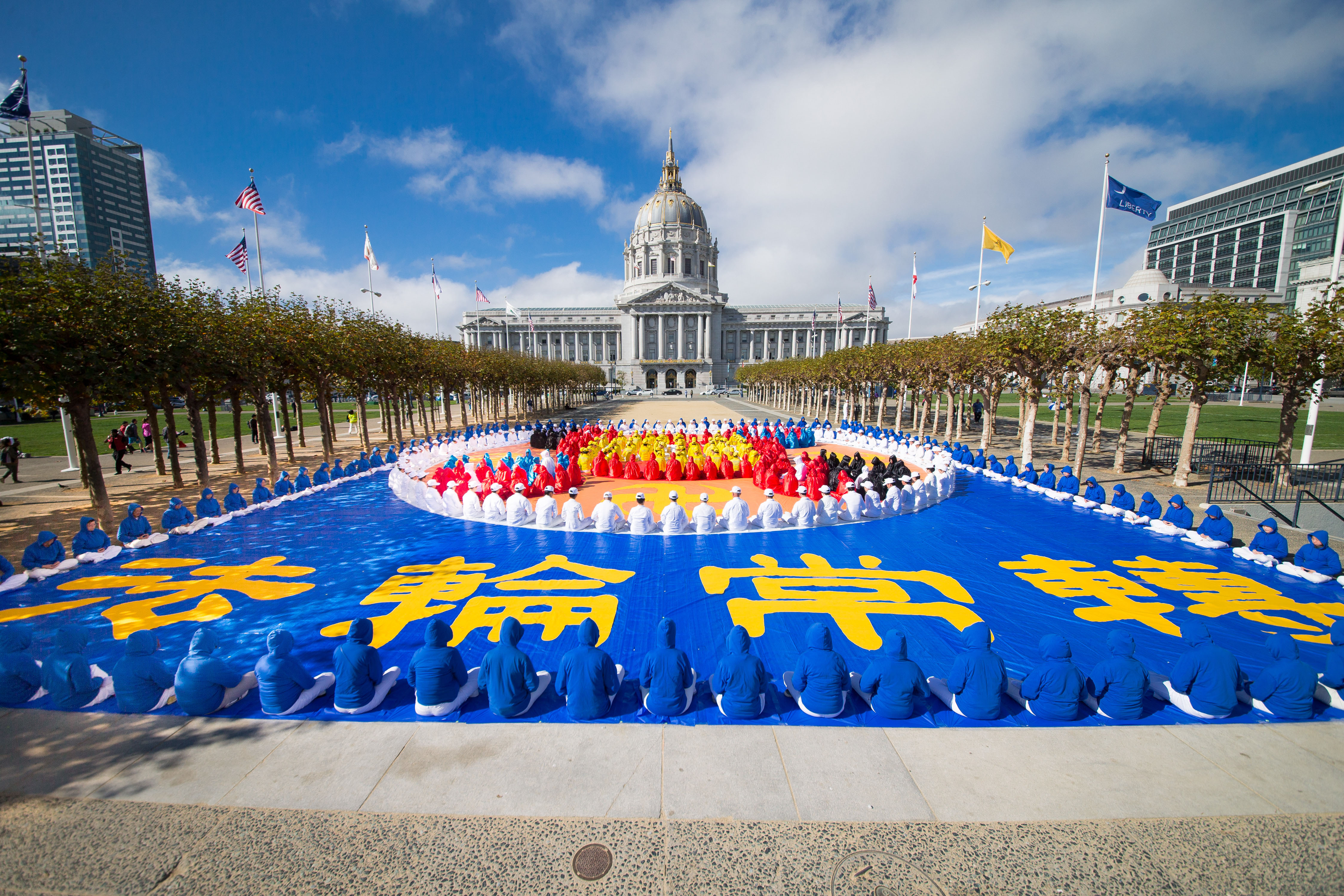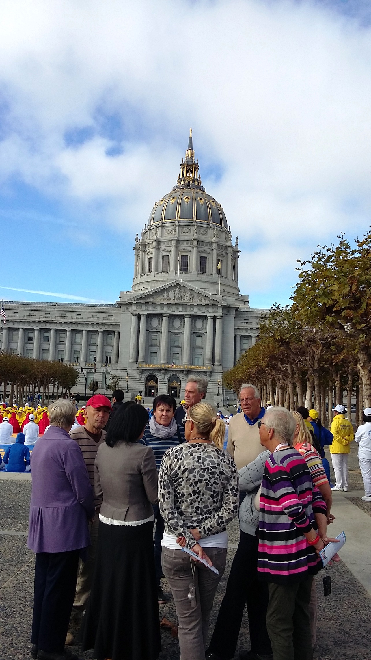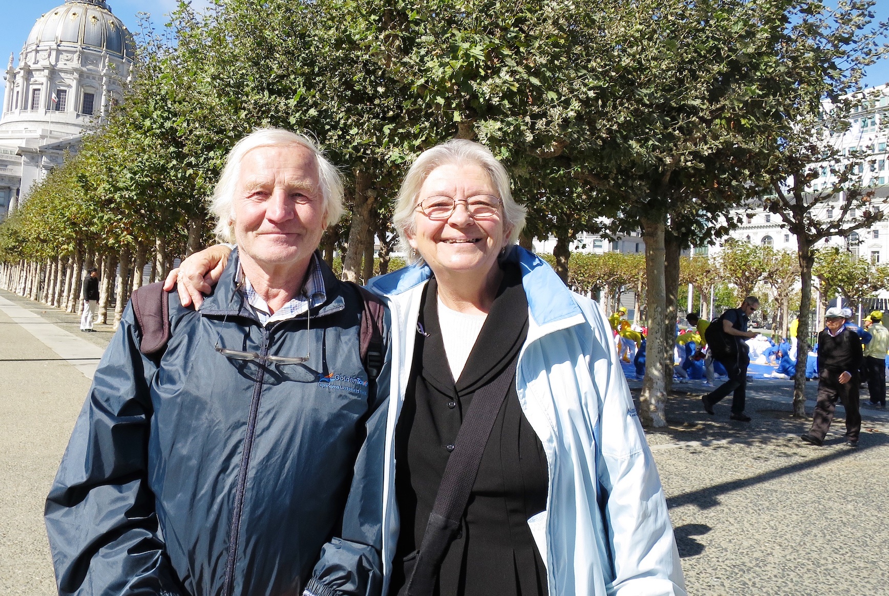 来自捷克的Bozena夫妇看到法轮功学员的排字活动后,夫妻俩人都觉得活动显得非常好看,Bozena女士在市政厅后面的旧金山歌剧院工作,他们觉得法轮功学员做的反迫害的事非常重要。