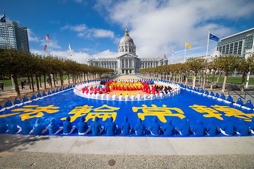![]() 图1-3:旧金山市政府广场上排出壮观而神圣的“法轮图形”图像和“法轮常转”字样 |