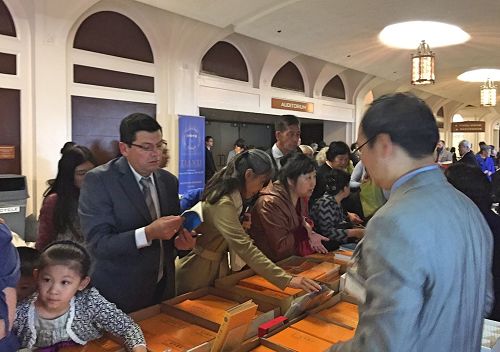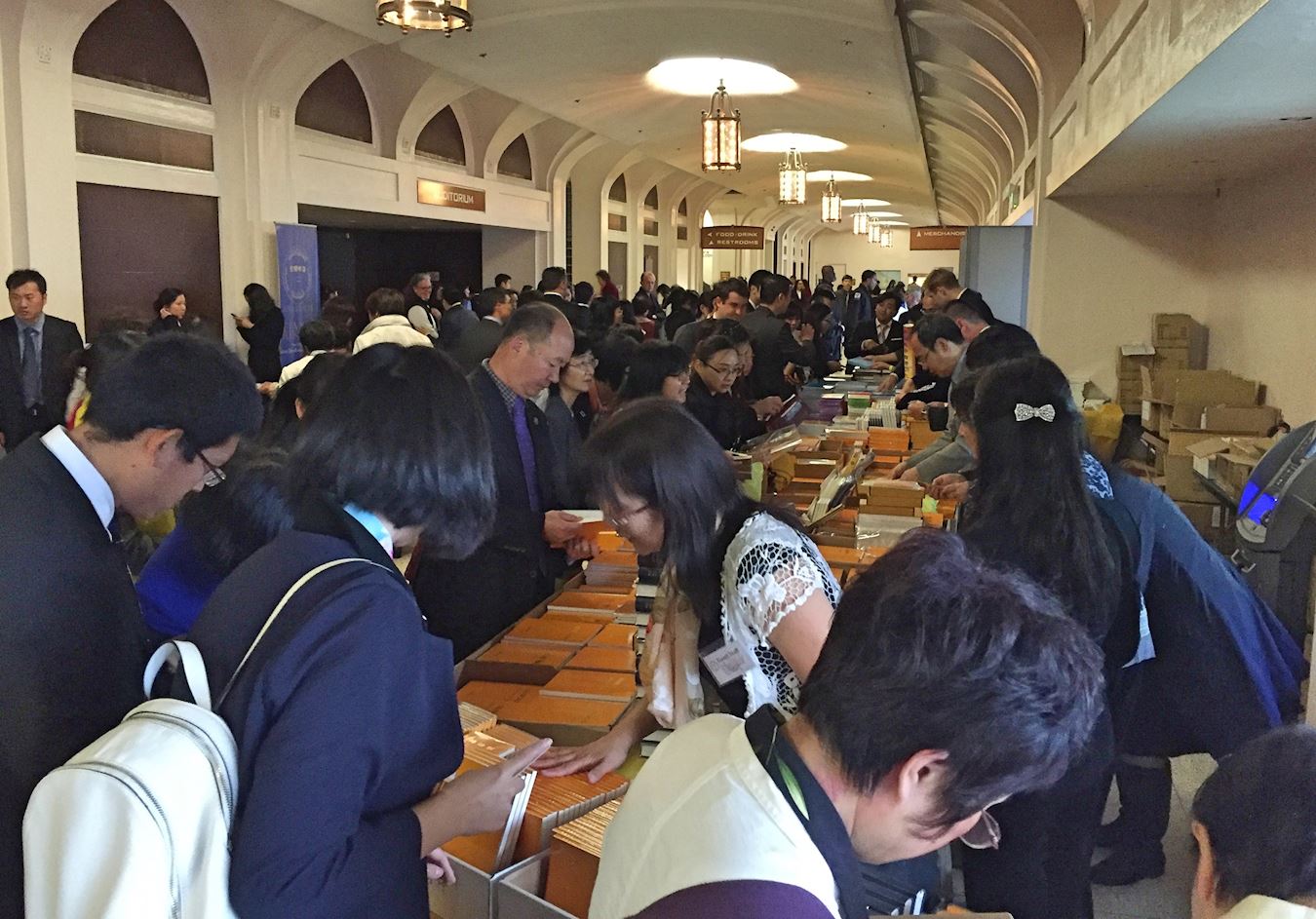 ![]() 图1-3:二零一六年十月二十四日,旧金山举办法轮大法修炼心得交流会,来自不同国家和地区的不同族裔的法轮功学员在法会间歇时,争相购买法轮功创始人李洪志先生的各种著作,与法轮功教功音像制品。 |