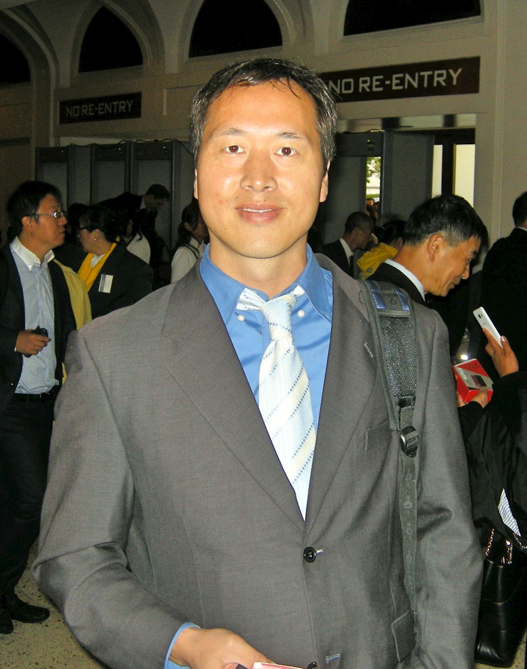 从澳洲来参加法会、特地跑到天梯书店摊位购买法轮功主要书籍《转法轮》的西人学员肖恩(Shawn Ward),三年前朋友送给他一本英文《转法轮》后,开始修炼。他说:修炼后,我以前的背痛消失了,喝酒抽烟都戒了,而且头脑思路清晰,感觉内心很纯净,对事物有洞察力。