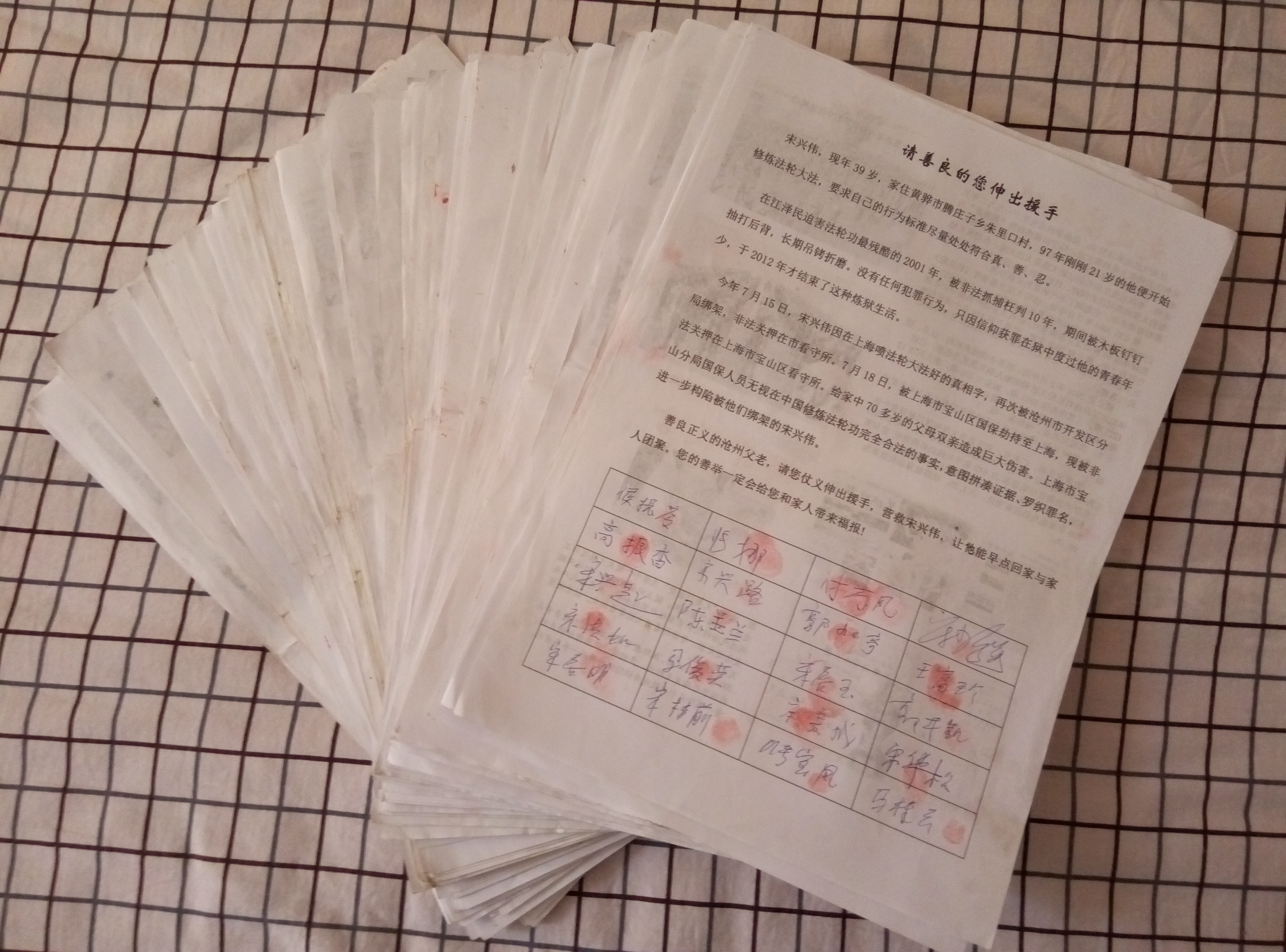 宋兴伟的遭遇引起沧州父老的同情,近期,近两千人用签名、按手印的方式要求当局尽快释放宋兴伟回家,声援法轮功学员。
