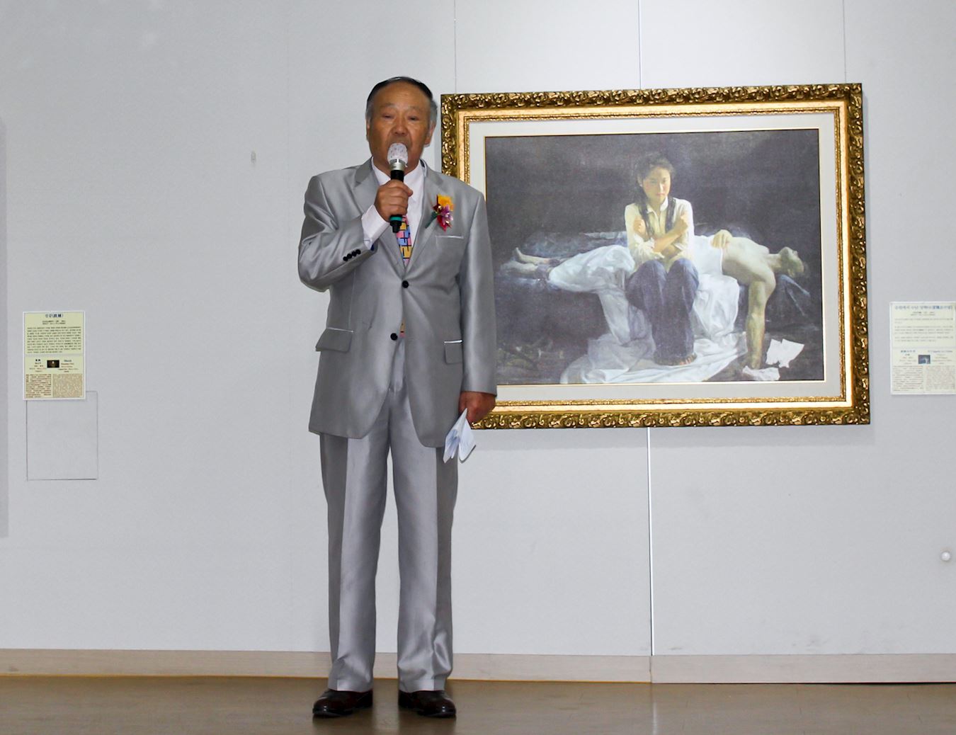 ![]() 图3:庆尚南道咸安郡守车政燮在开幕式上表示:“希望通过这次美术展,能让更多的人了解法轮功的真相。” |