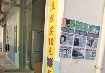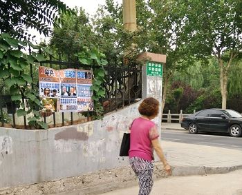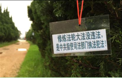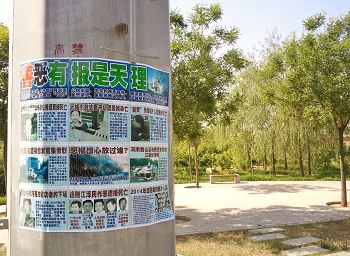 山东省莱州市街道上的真相展板和树挂