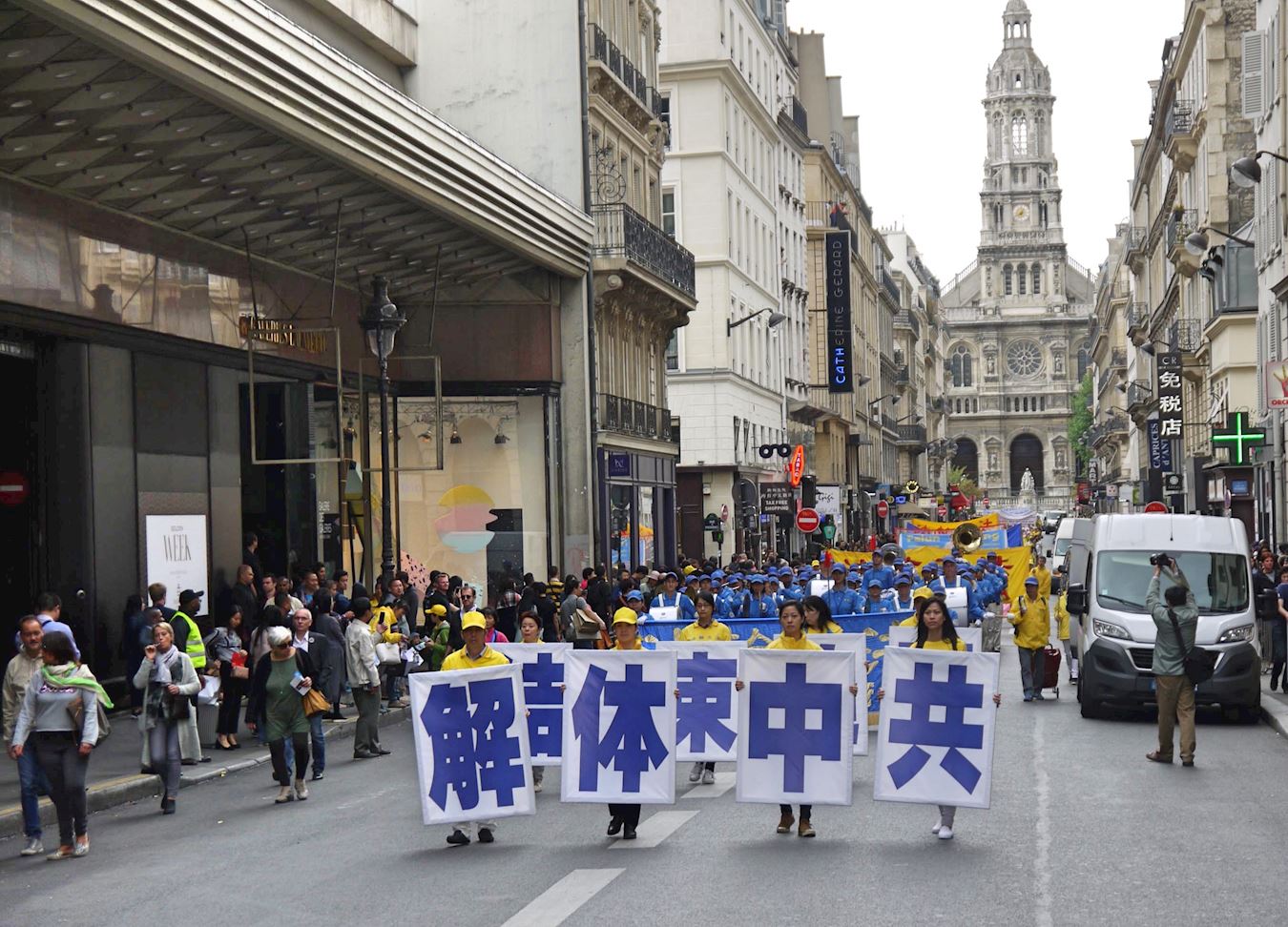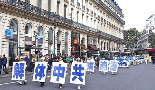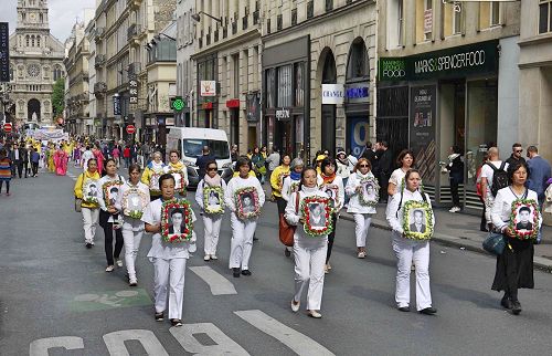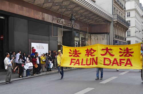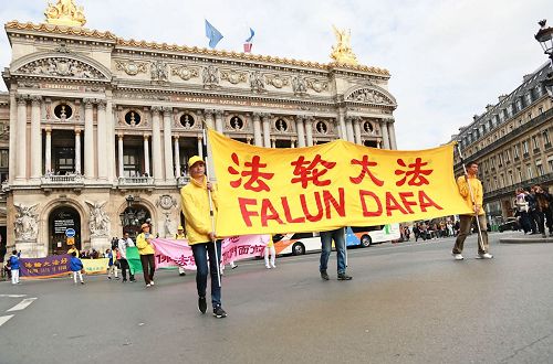 游行队伍由欧洲天国乐团开路,从巴黎天主圣三教堂(église de la Sainte-Trinité)出发,途经巴黎百年老店拉法耶特商场、春天百货公司、奥斯曼大道、巴黎歌剧院、歌剧院大道、圣奥诺雷路(rue Saint-Honoré),最后到达皇宫广场。所经之处,人们被天国乐团清澈的旋律吸引,对法轮功学员和平理性的游行倍加赞赏,并接过介绍法轮功的真相传单。