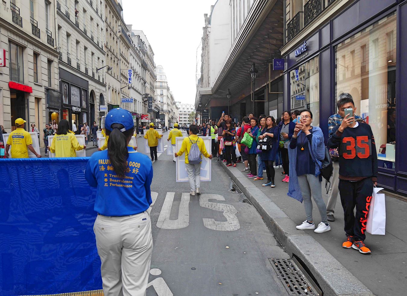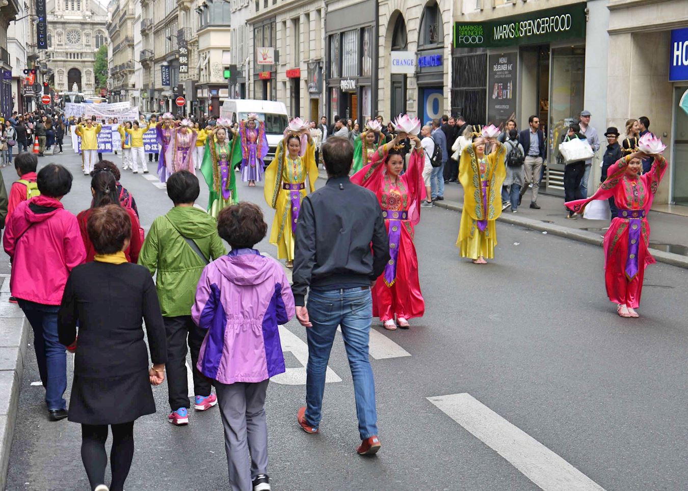当游行队伍经过拉法耶特商场免税店时,已经有很多大陆游客等在路边了。有的游客说:“我们真没想到,法轮功气势这么大。以前以为就那么几个人,是花钱买来的。现在知道了,你们是真的。这么大的规模,真了不得。”有的游客抓紧时机拍照,说要带回国内去给大家看看,这么声势浩大,还说:“我们感到为中国人自豪,将来中国就指着你们法轮功了,只有你们能治得了中国!”