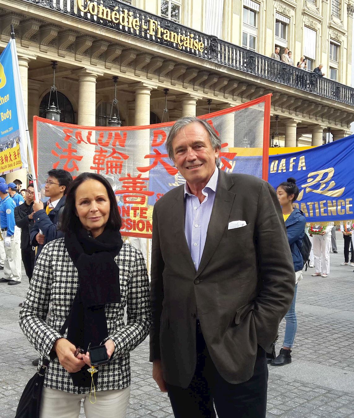 ![]() 图11:Marie-José Marie-José(左)是画家,她认为法轮功的游行很好,很平和,与巴黎其它游行不同。 |