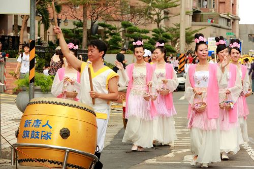 今年活动以“人文关渡好玩艺”为主题,除市集、表演,重头戏就是三千多人展现庶民艺术创意与特色,自制道具与装扮踩街游行活动。秋高气爽的午后,踩街队伍分三路从邻里巷弄出发,沿路精彩表演高潮不断。法轮功学员组成的旗鼓队、腰鼓队、仙女队在“法轮大法”、“真善忍”横幅引导下前行。