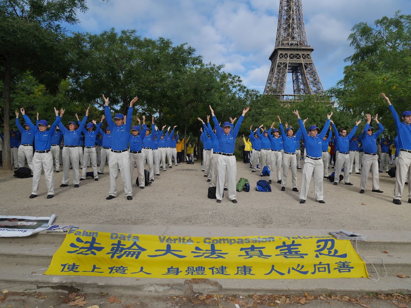 '图8:在著名的埃菲尔铁塔下集体炼功'
