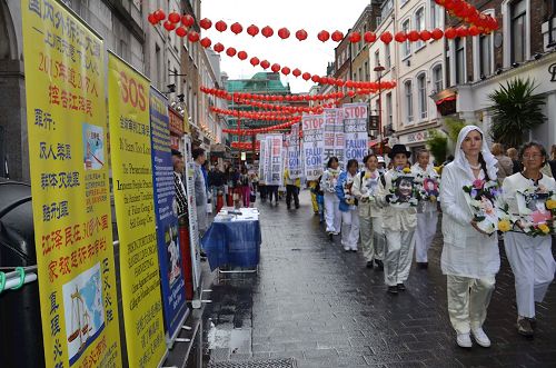 中午十二点,法轮功学员们的游行队伍从位于中使馆对面的二十四小时和平反迫害真相点出发,在伦敦市中心繁华街道上的人流中穿行,途径摄政大街(Regent Street)、皮卡迪利广场(Piccadilly Circus)等伦敦中心商业地段,然后来到伦敦唐人街行进两周,最后在著名的特拉法加(Trafalgar Square)北平台结束游行。学员们沿途分发了大量的真相传单,许多民众向学员表达支持。
